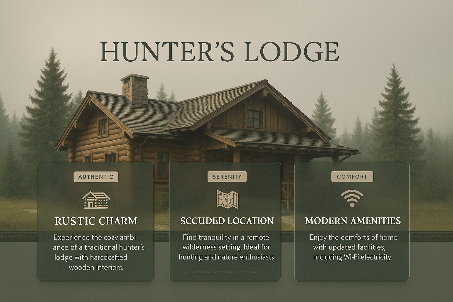 /Collection: /by davooda/Type: PNG/This image features a stylish illustration of a hunter's lodge, surrounded by trees. It includes design blocks integrating text and icons, enhancing the cozy atmosphere.