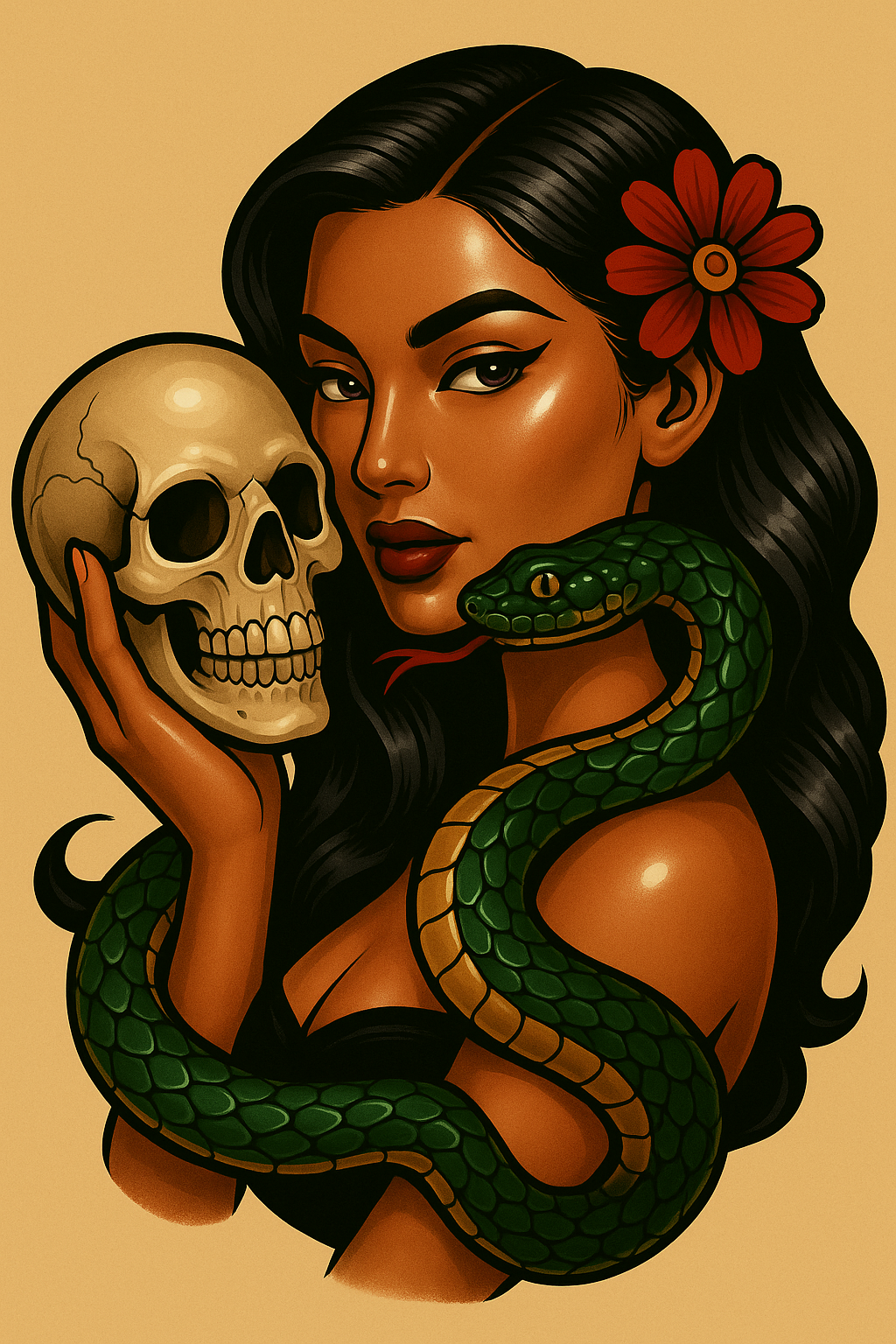 A striking illustration of a woman holding a skull in one hand and a snake wrapped around her arm. The artwork features a glossy, polished finish and a warm beige background, reminiscent of classic tattoo art.