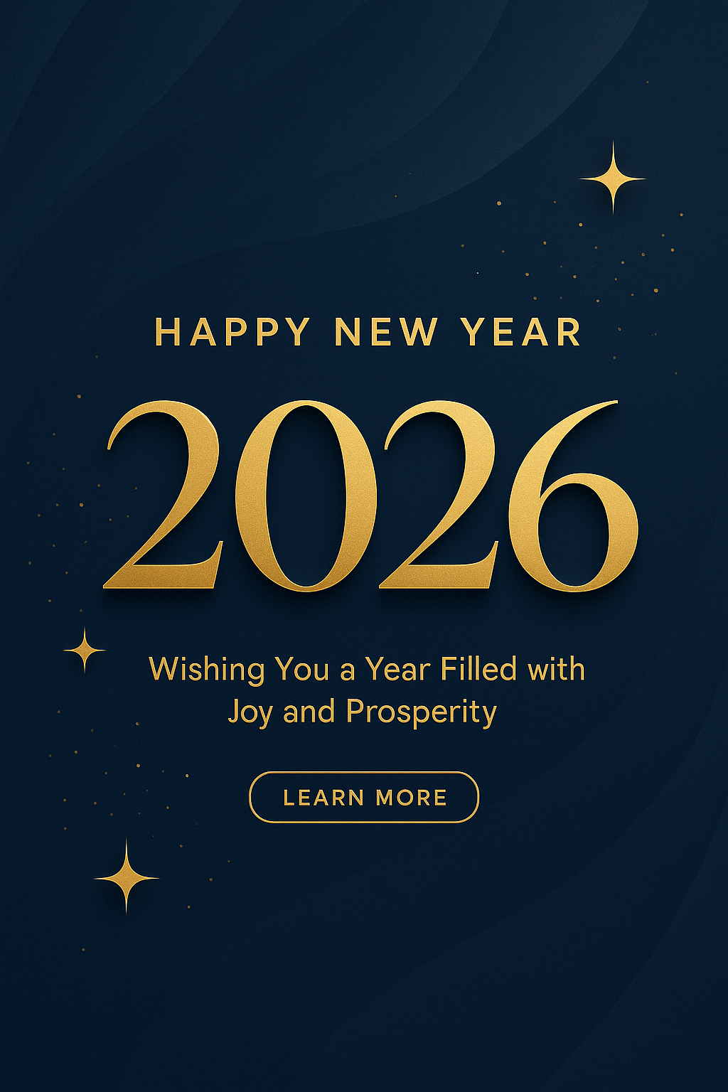 Stylish greeting card design for New Year 2026 featuring gold typography on a dark blue background, ideal for festive celebrations and social media sharing.
