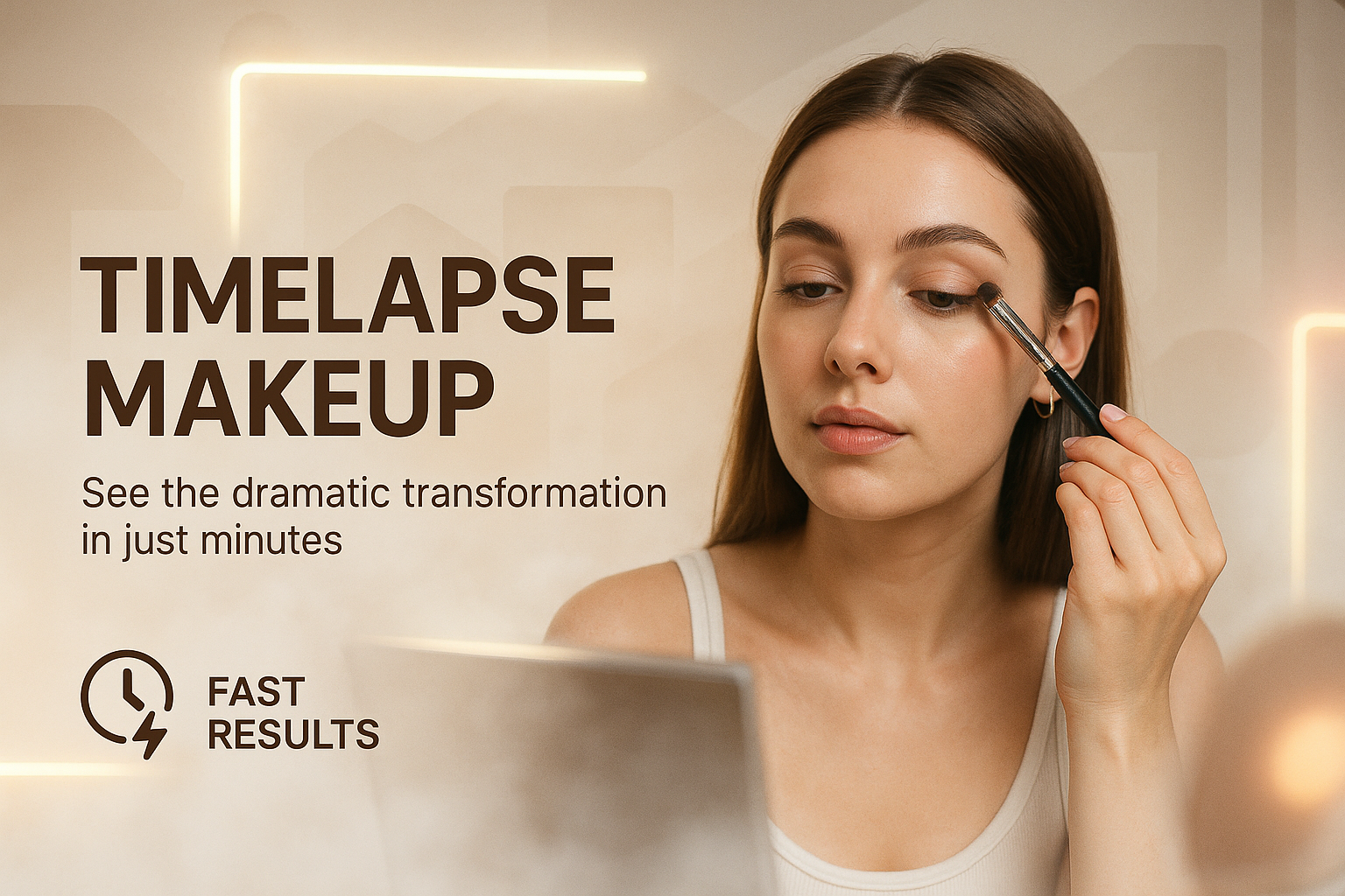 /Collection: /by davooda/Type: PNG/Engaging social media post showcasing a timelapse makeup tutorial. The image features a young woman applying makeup, emphasizing quick and dramatic results, ideal for beauty enthusiasts.