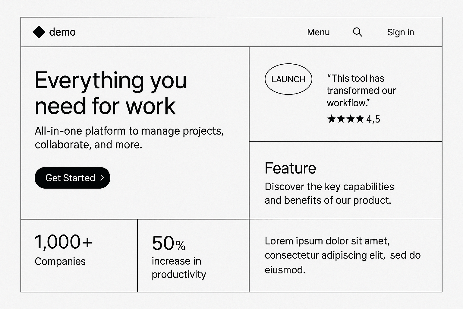 /Collection: /by davooda/Type: PNG/A sleek landing page design showcasing a bento grid layout. Features include a geometric logo, sign-in button, and marketing block with stars. The overall aesthetic is clean and professional.