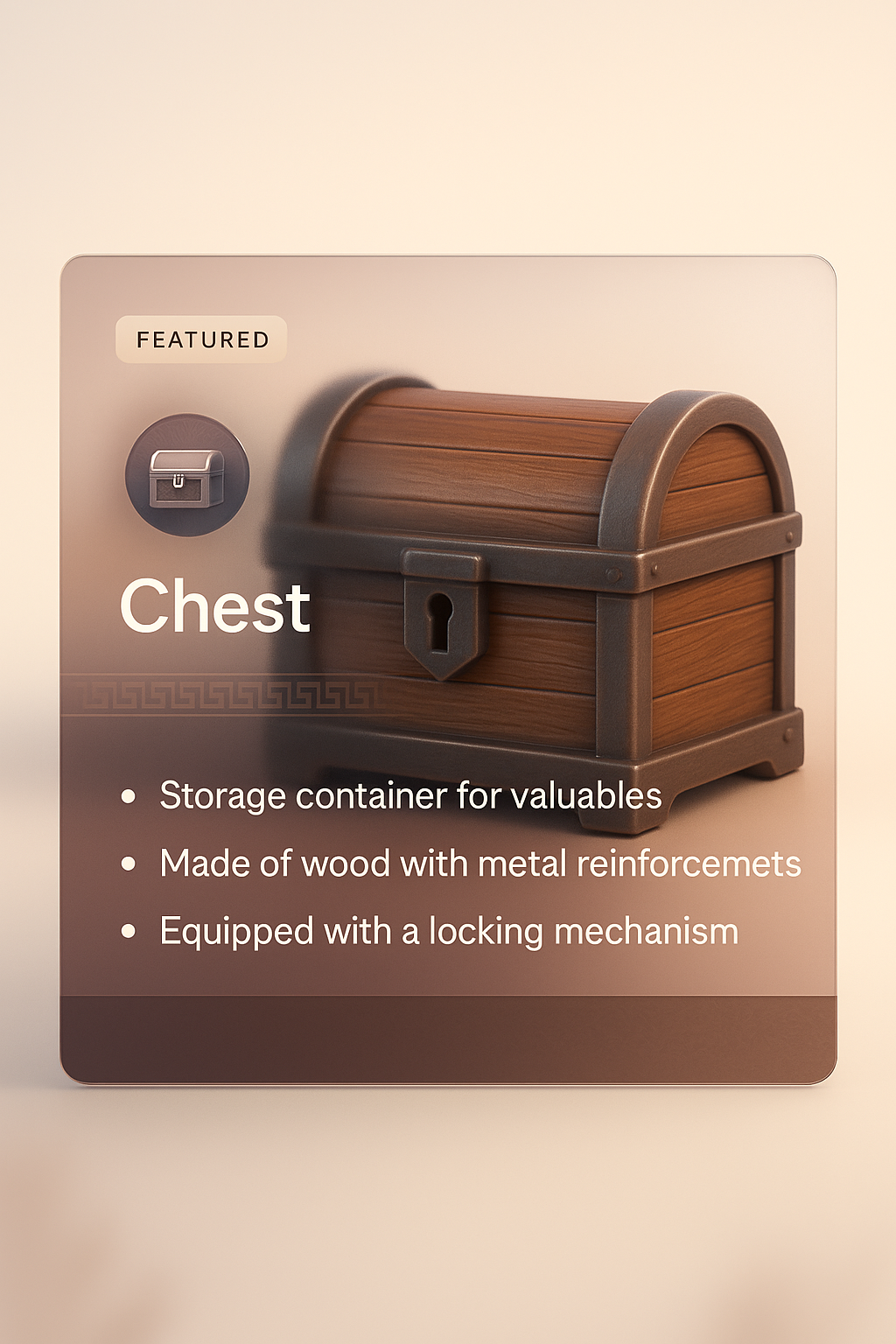 A 3D illustration of a wooden chest with metal reinforcements, featuring a locking mechanism. The design includes a light gradient background and a transparent overlay with text.