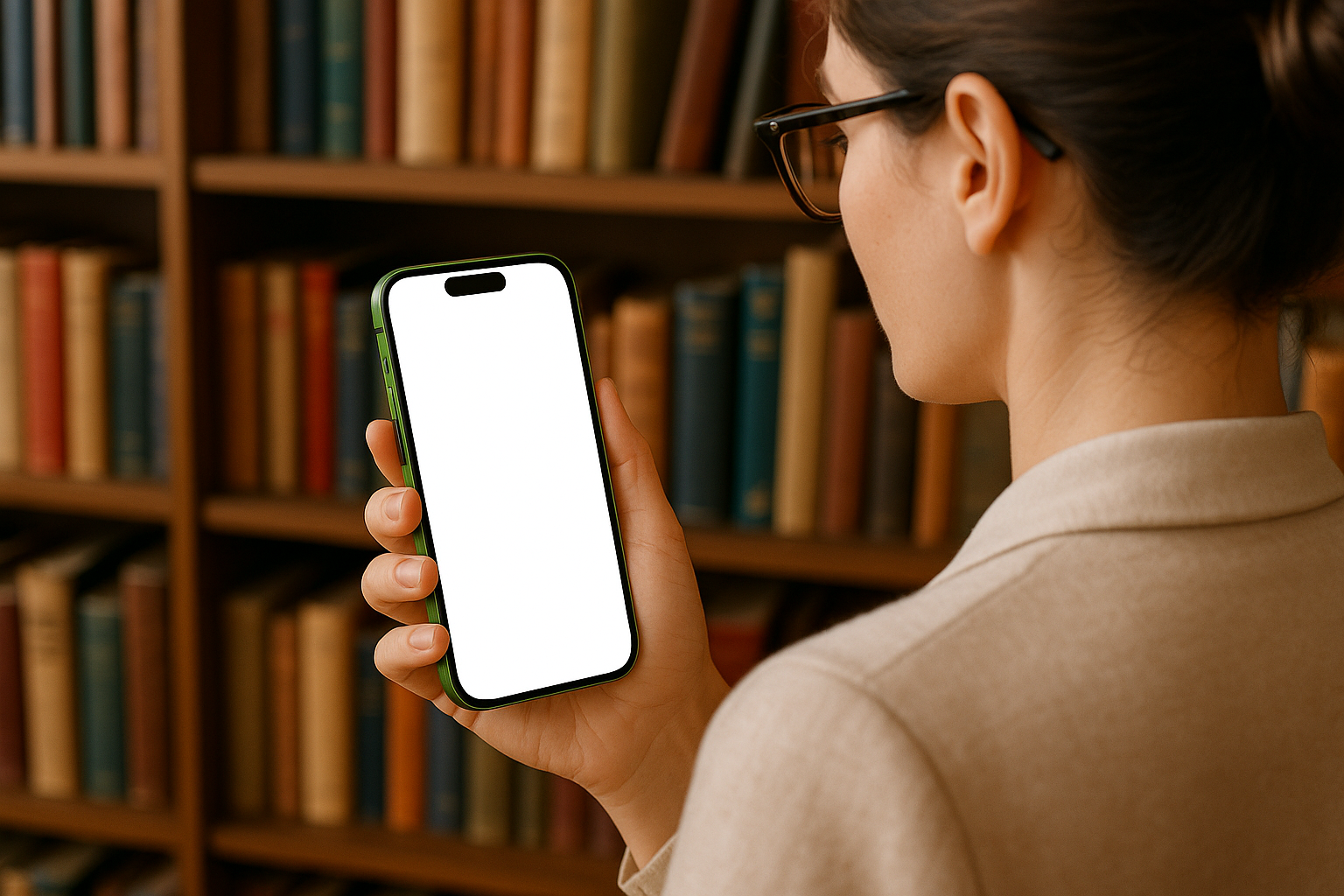 A woman librarian wearing glasses holds a green phone with a blank screen, surrounded by shelves of books. The dynamic shot captures her from behind, focusing on the phone.