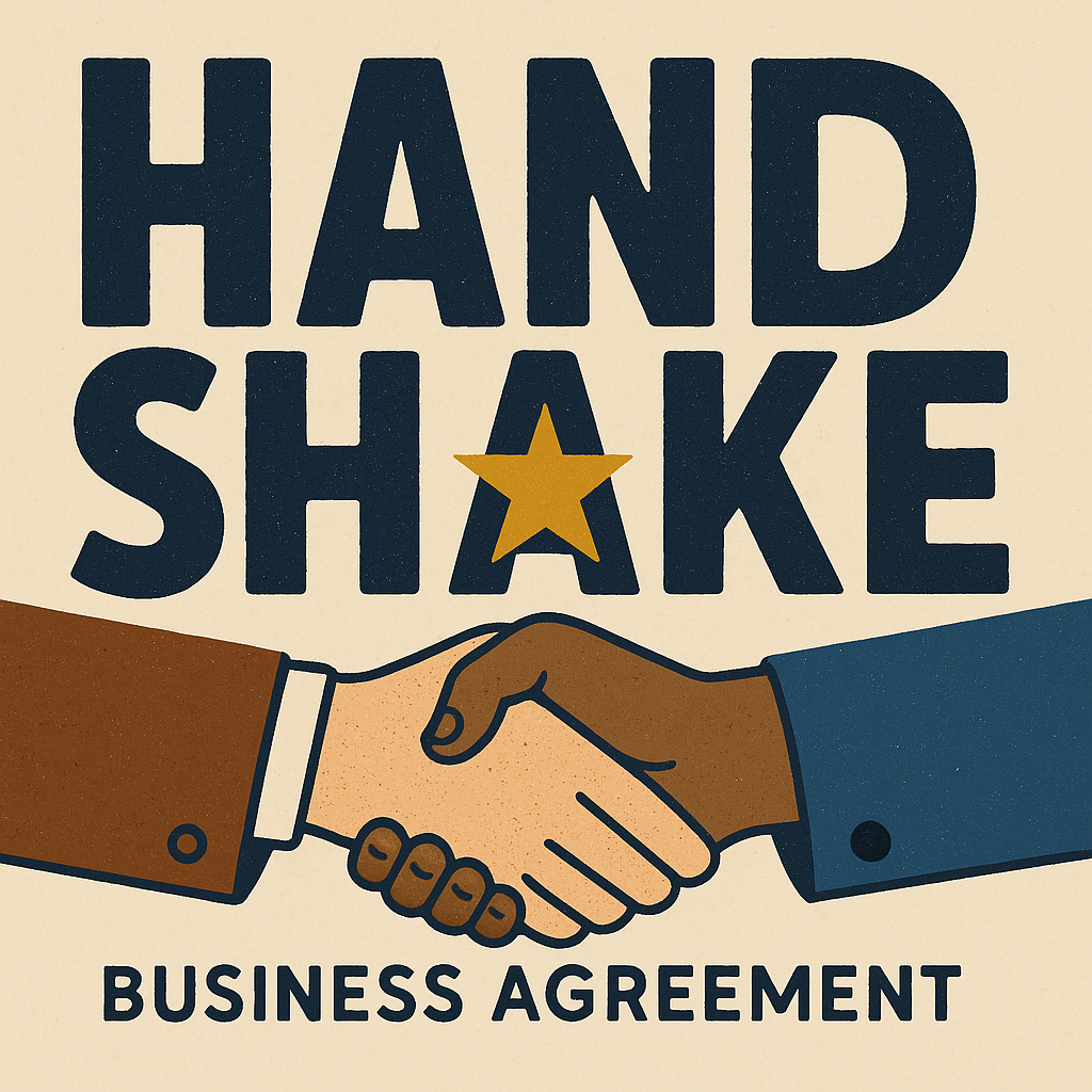 /Collection: /by davooda/Type: PNG/A stylish illustration showcasing a handshake, symbolizing a business agreement. The design features contrasting skin tones, bold typography, and a vintage aesthetic, making it ideal for corporate or entrepreneurship-related content.