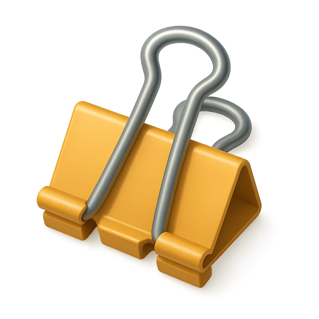 A 3D rendered icon of a bulldog clip, showcasing a yellow triangular body with metallic silver clips. The design features an isometric view and a smooth, volumetric appearance against a gradient background.