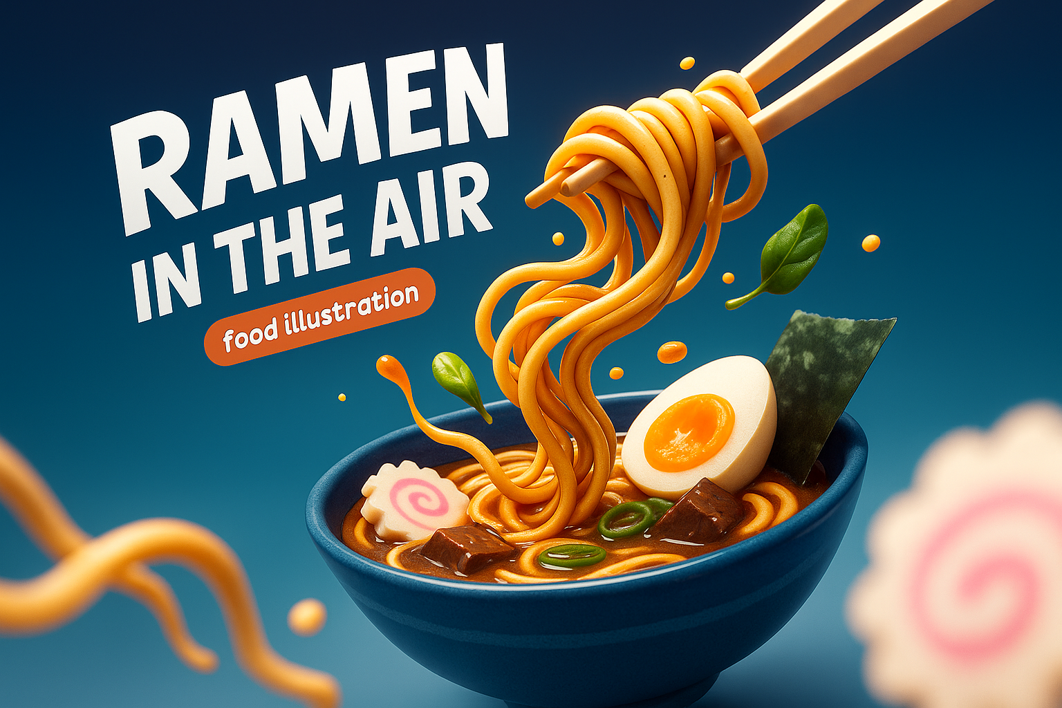 Dynamic 3D Ramen Illustration with Floating Noodles
