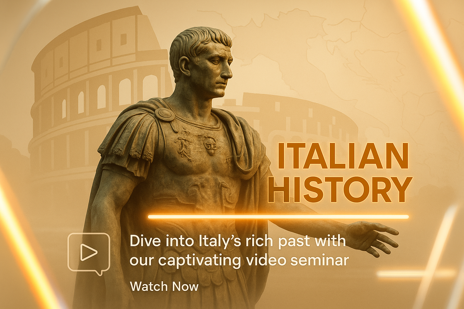 /Collection: /by davooda/Type: PNG/Engaging promotional graphic featuring a statue representing Italian history, designed for a video seminar. The warm color palette and modern layout attract viewers interested in cultural education.