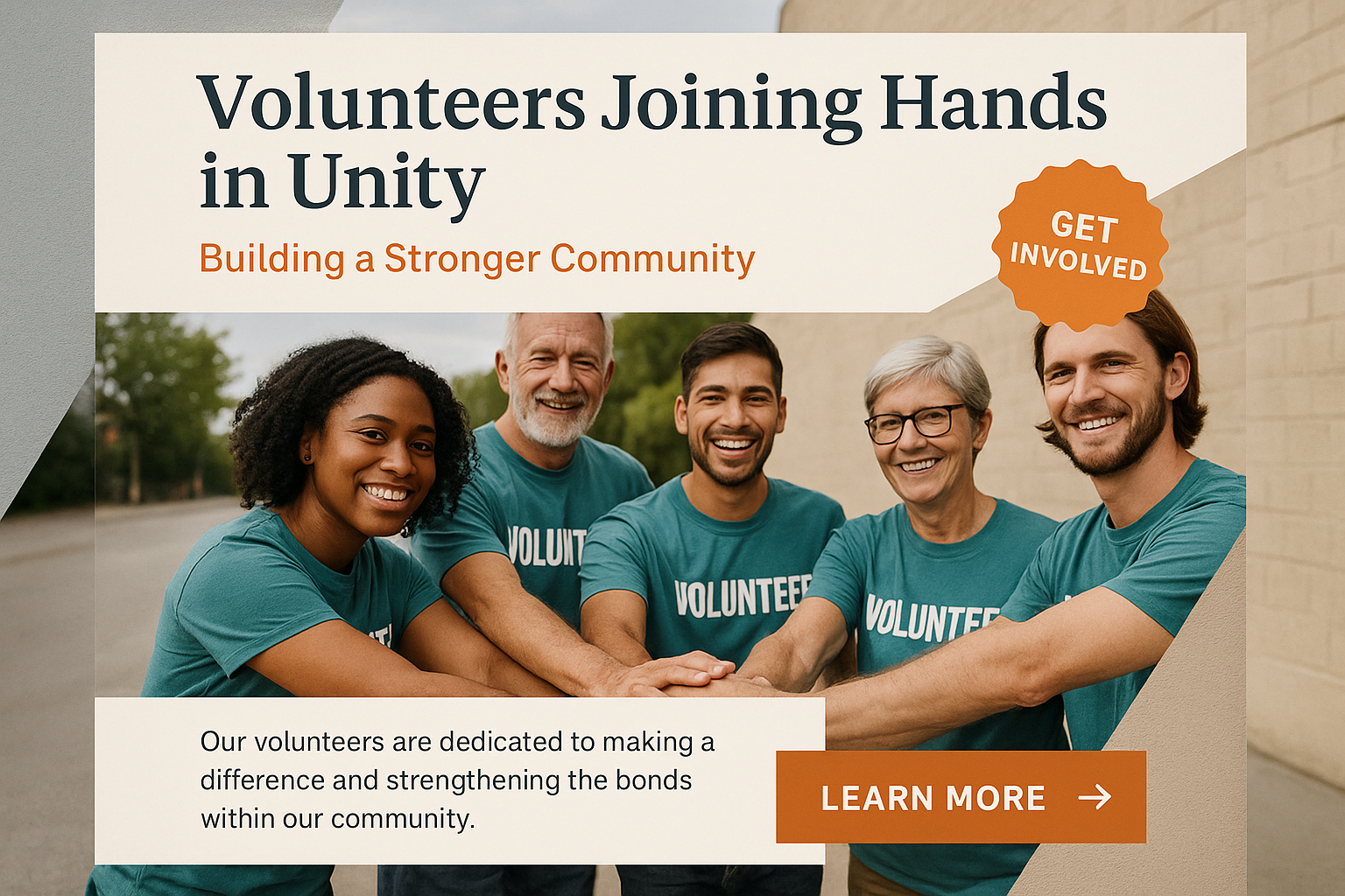 /Collection: /by davooda/Type: PNG/A diverse group of volunteers, smiling and joining hands, symbolizes unity and collaboration. The design features a clear hierarchy with vibrant colors and engaging elements, emphasizing community strength.