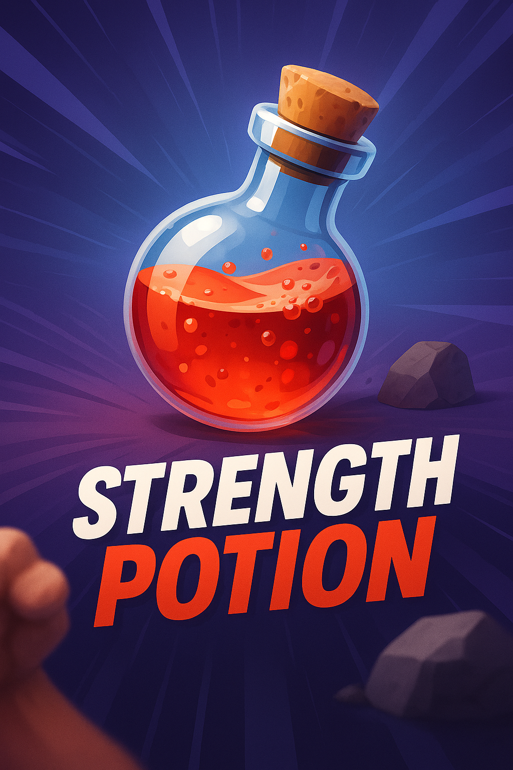 /Collection: /by davooda/Type: PNG/A vibrant illustration of a strength potion in a glass vial, set against a dynamic gradient background. The title 'STRENGTH POTION' is prominently displayed in bold, eye-catching text.