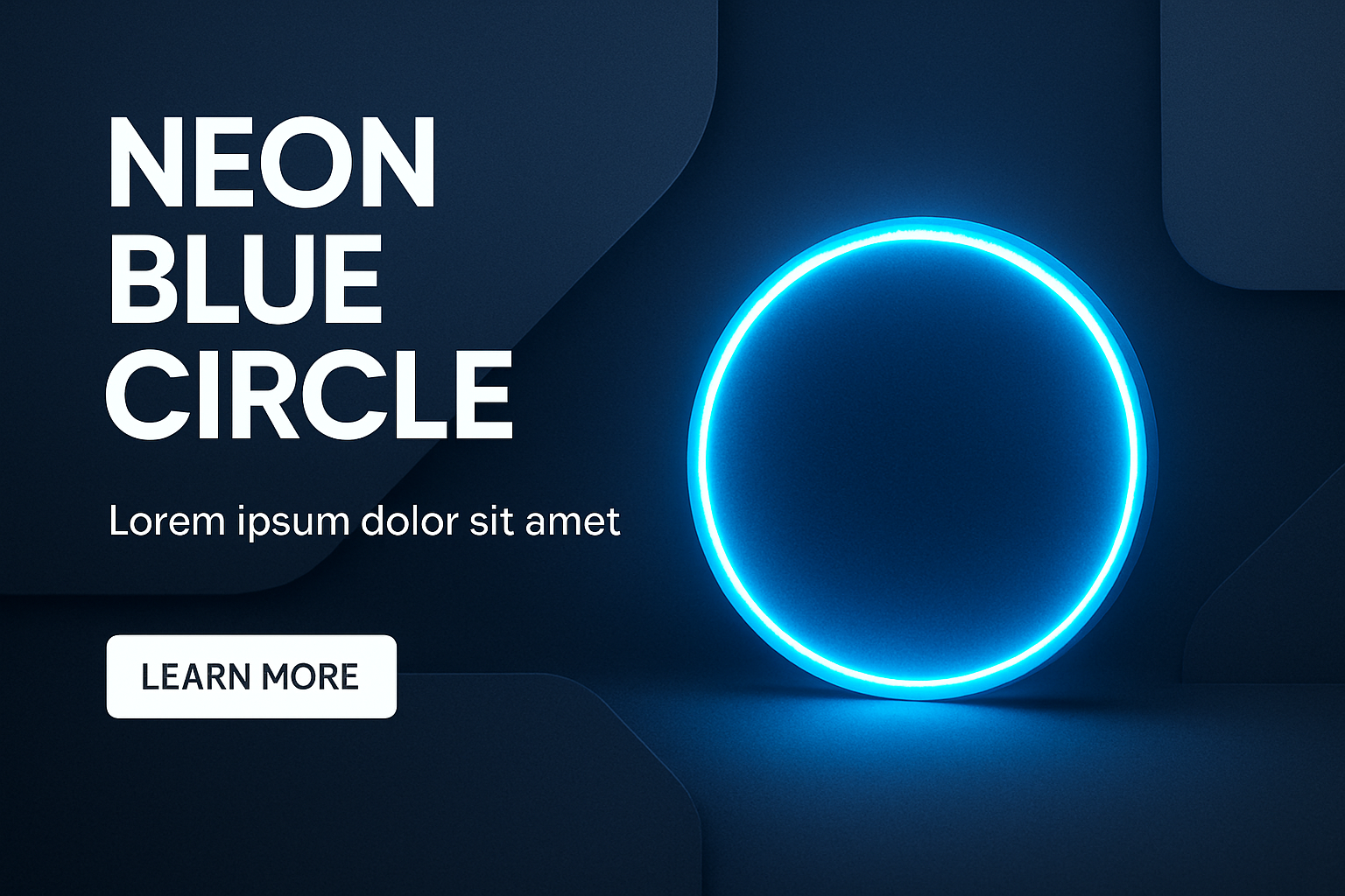 A striking neon blue geometric circle is prominently displayed against a dark background, complemented by bold typography and a call-to-action button, creating a modern and professional design.