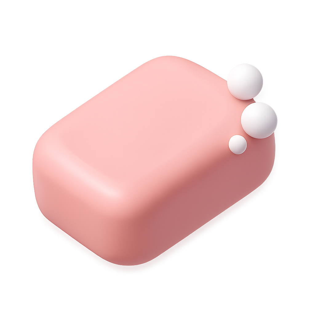 A modern 3D representation of a soap bar in a soft pink hue, featuring glossy surfaces and a three-quarter view. The design includes three white bubbles adding to its aesthetic appeal.