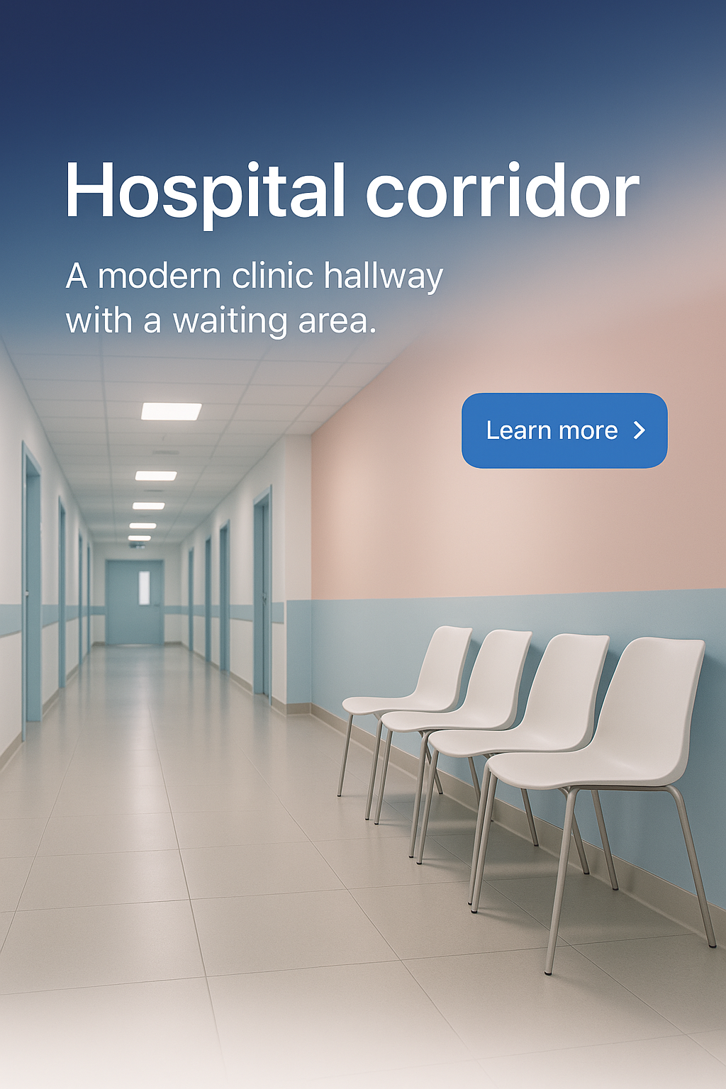 An empty and modern hospital corridor featuring white chairs for patients. The interior showcases a blend of pastel blue and pink hues, creating a calming atmosphere.