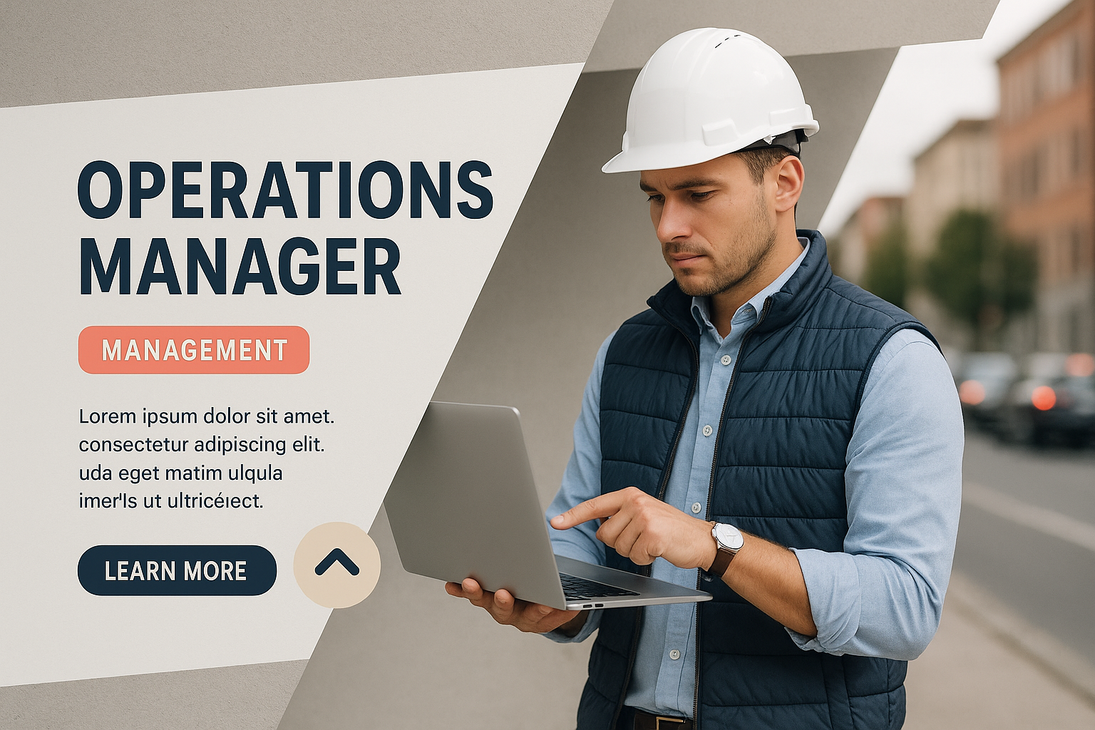 /Collection: /by davooda/Type: PNG/The image features a man in a hard hat, using a laptop. The design includes layered elements, contrasting colors, and a clear hierarchy, emphasizing the role of an Operations Manager.
