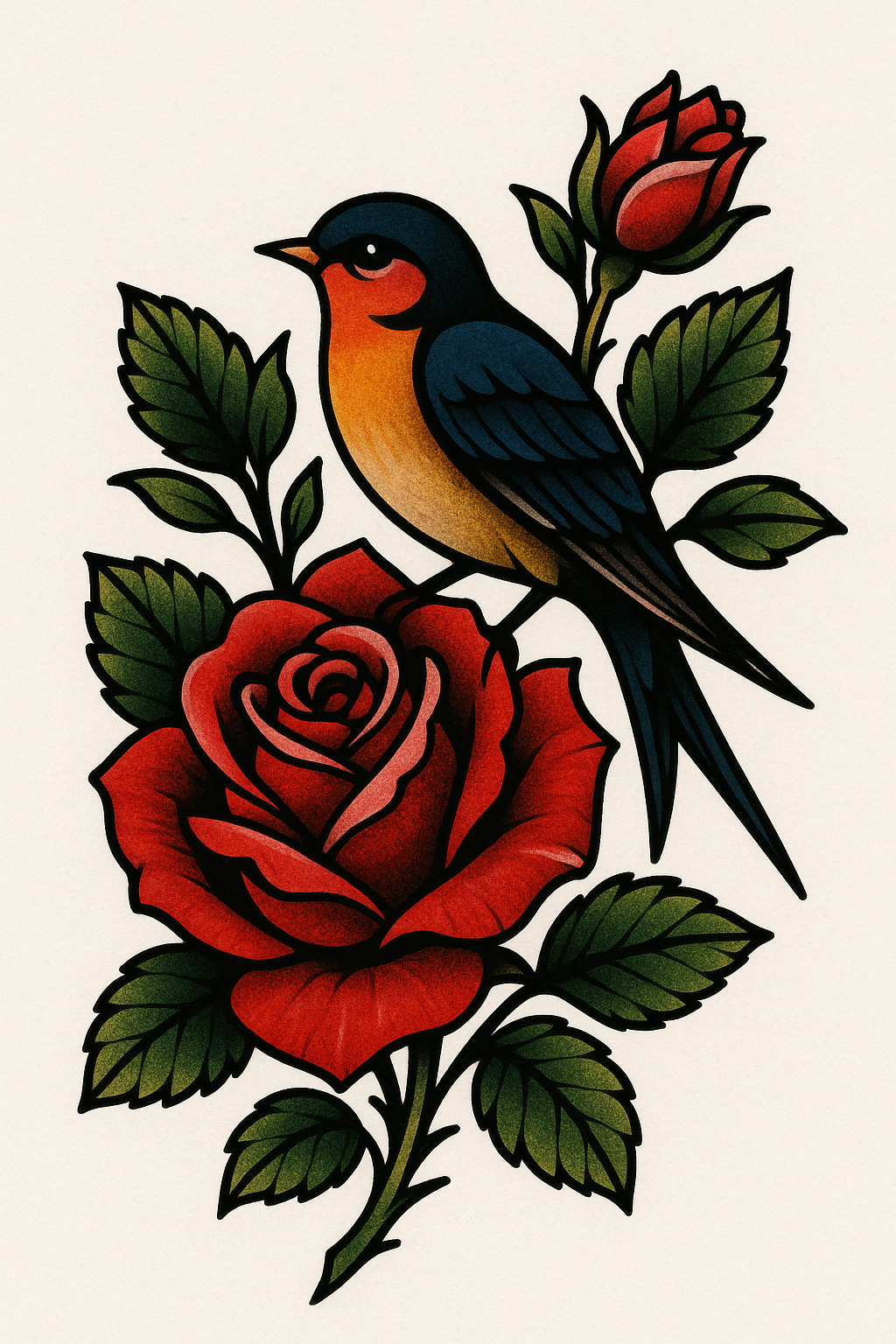 /Collection: /by davooda/Type: PNG/A vibrant traditional tattoo design showcasing a colorful bird perched on a large red rose and a budding rose. The bold lines and rich colors emphasize the classic tattoo style, appealing to tattoo enthusiasts and artists.