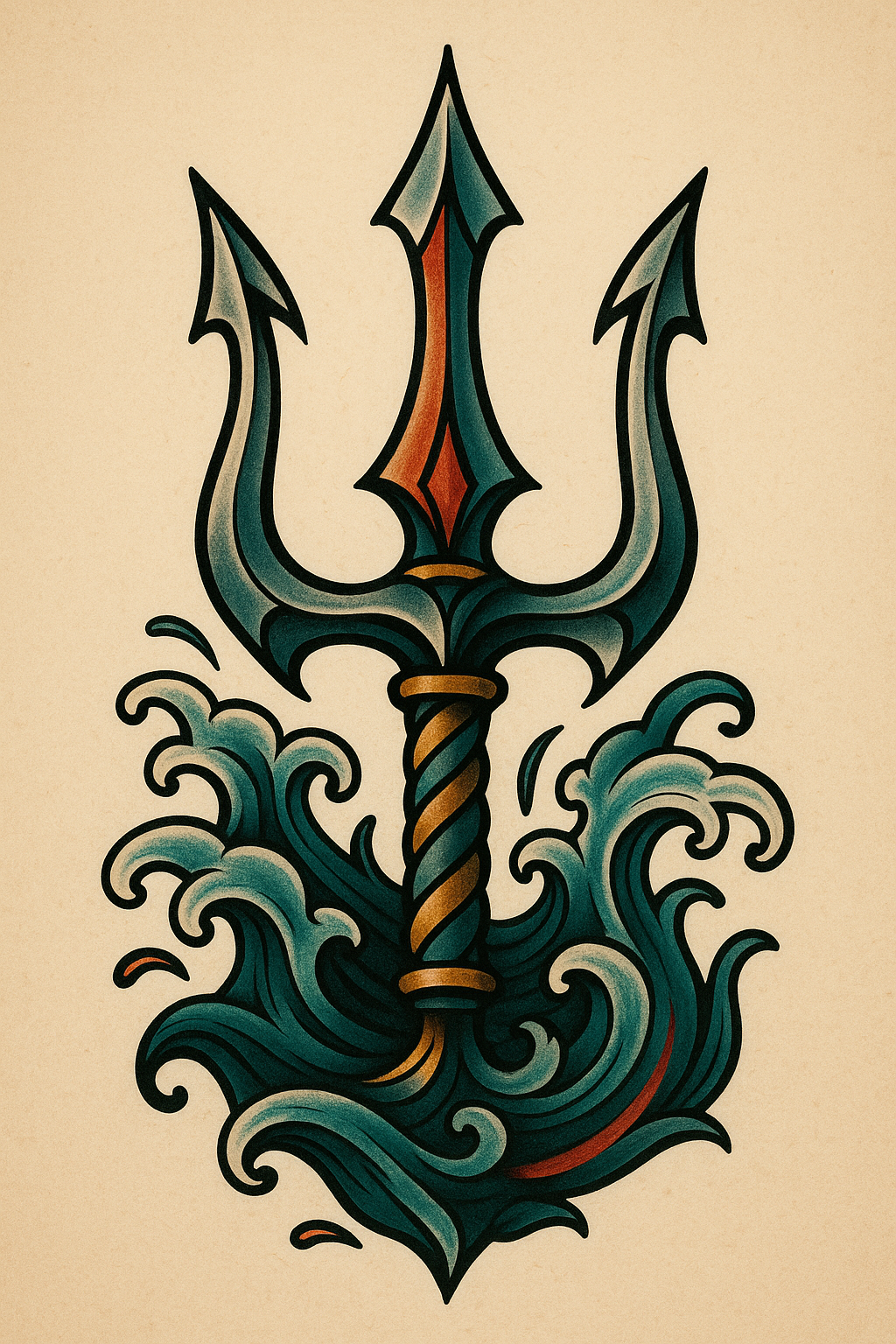 This image features a stylized illustration of a trident surrounded by dynamic waves, showcasing vibrant colors and bold lines. It's ideal for use in nautical-themed designs.