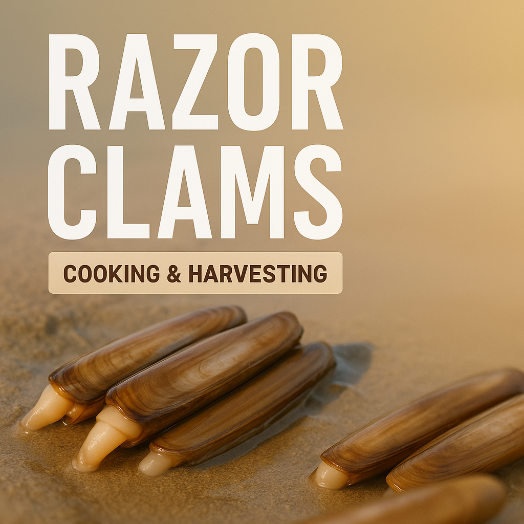 /Collection: /by davooda/Type: PNG/A visually appealing YouTube thumbnail featuring razor clams on a sandy background. The design includes bold text highlighting cooking and harvesting, with a clean, minimalist aesthetic.
