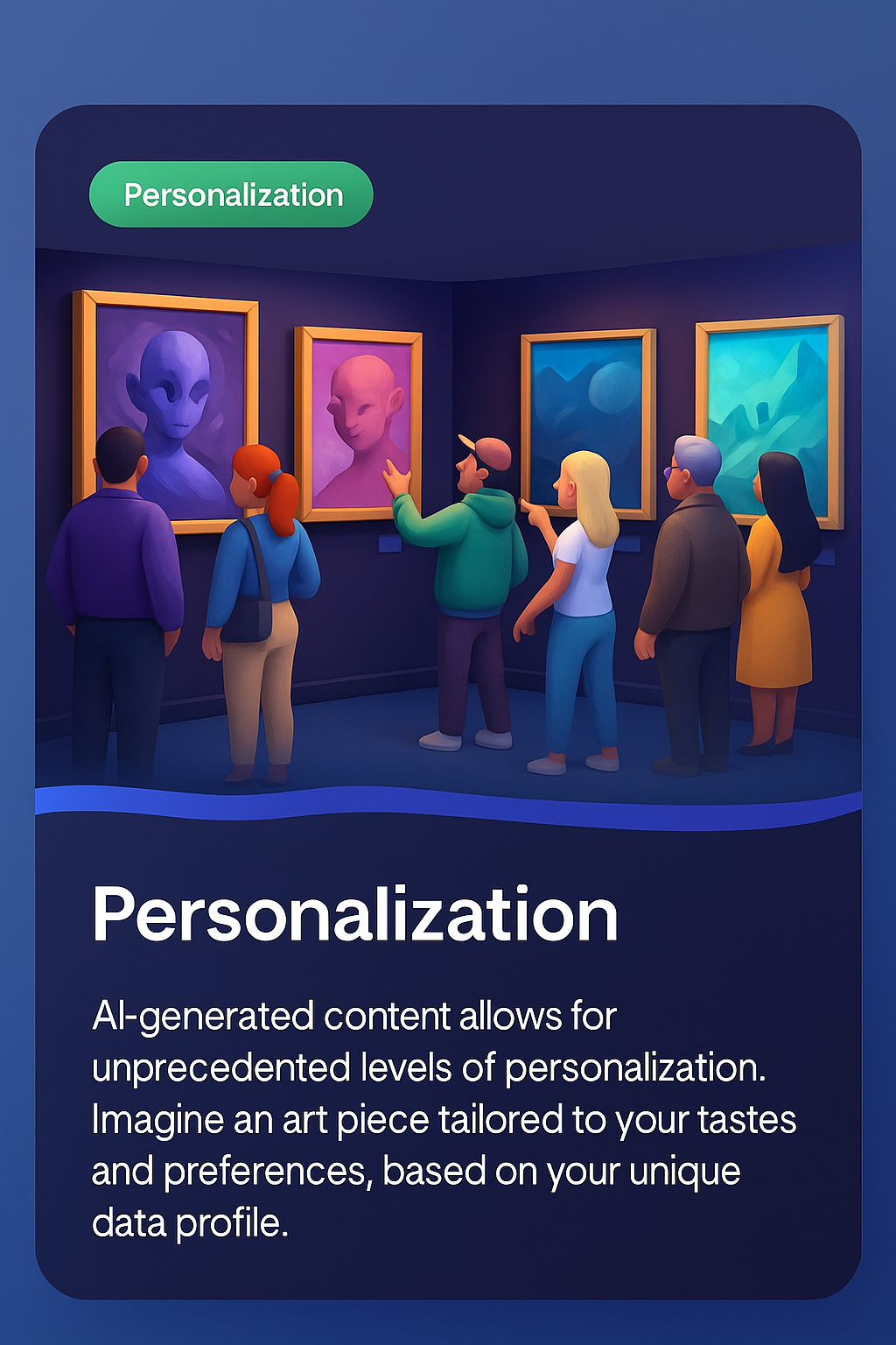 A group of diverse individuals engage with art in a gallery setting, admiring personalized AI-generated artworks. The scene features vibrant paintings and dynamic interactions.