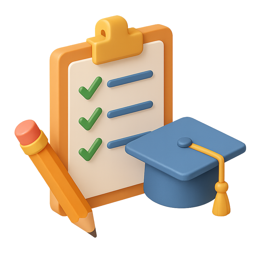 A colorful 3D icon depicting a graduation cap next to a clipboard with checkmarks and a pencil. The design emphasizes education and achievement.