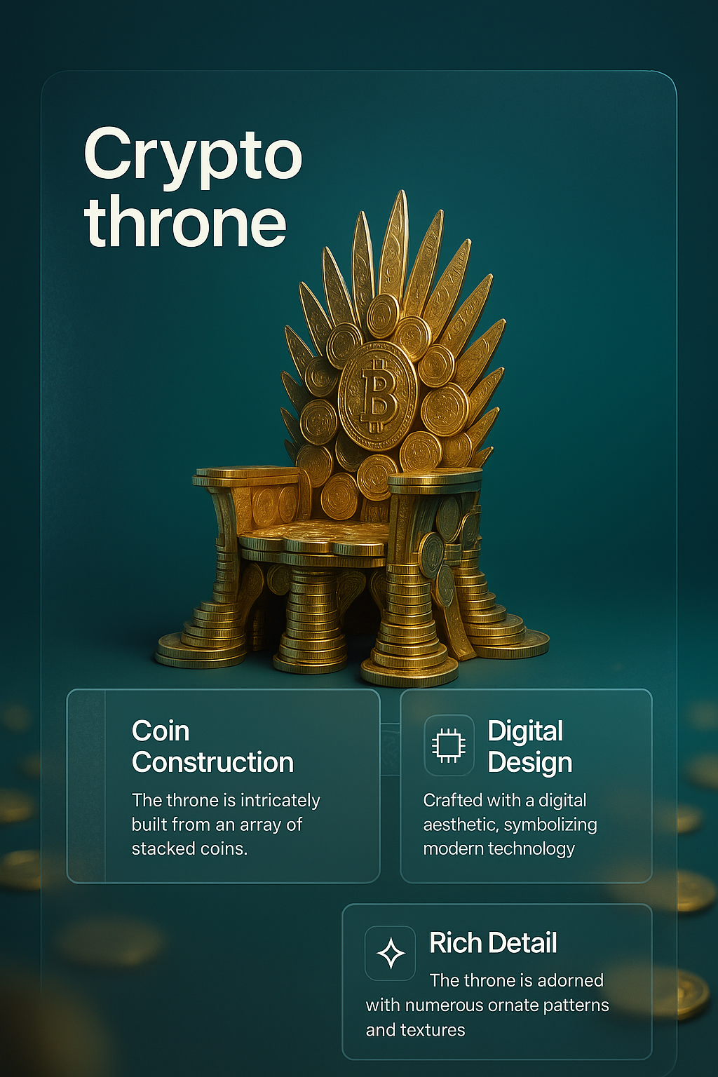 /Collection: /by davooda/Type: PNG/A visually striking 3D illustration of a throne made from stacked coins, showcasing a blend of digital aesthetics and rich details. The design features ornate patterns and a smooth gradient background for a modern look.