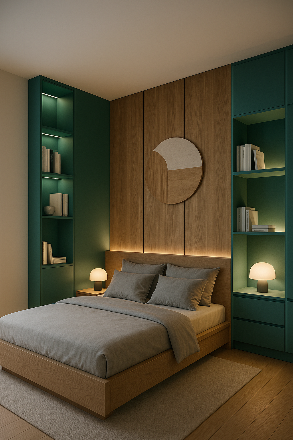 /Collection: /by davooda/Type: PNG/This image showcases a modern minimalist bedroom featuring warm wooden elements, soft lighting, and a soothing color palette with green accents. A round mirror adds a stylish touch.