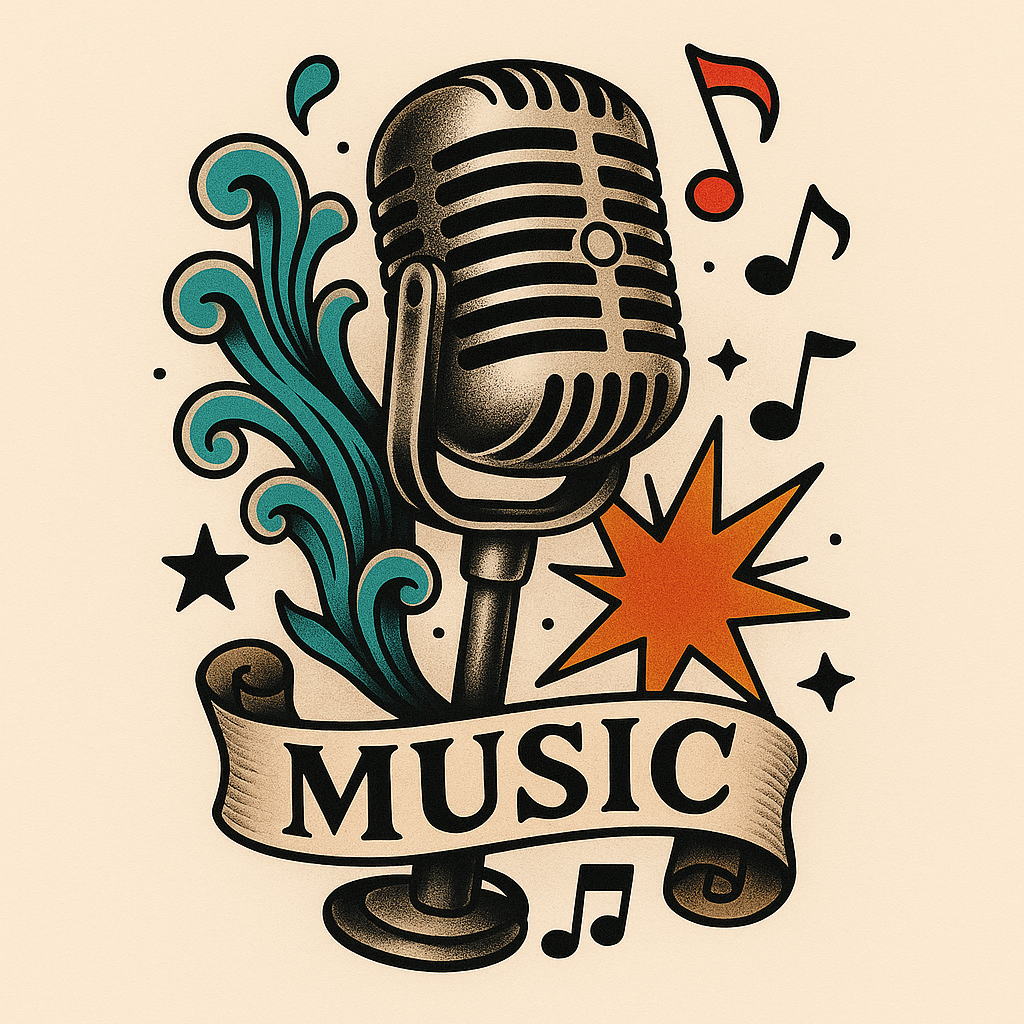 Stylized illustration of a vintage microphone surrounded by musical notes and decorative elements. Ideal for music-related branding or artistic projects.