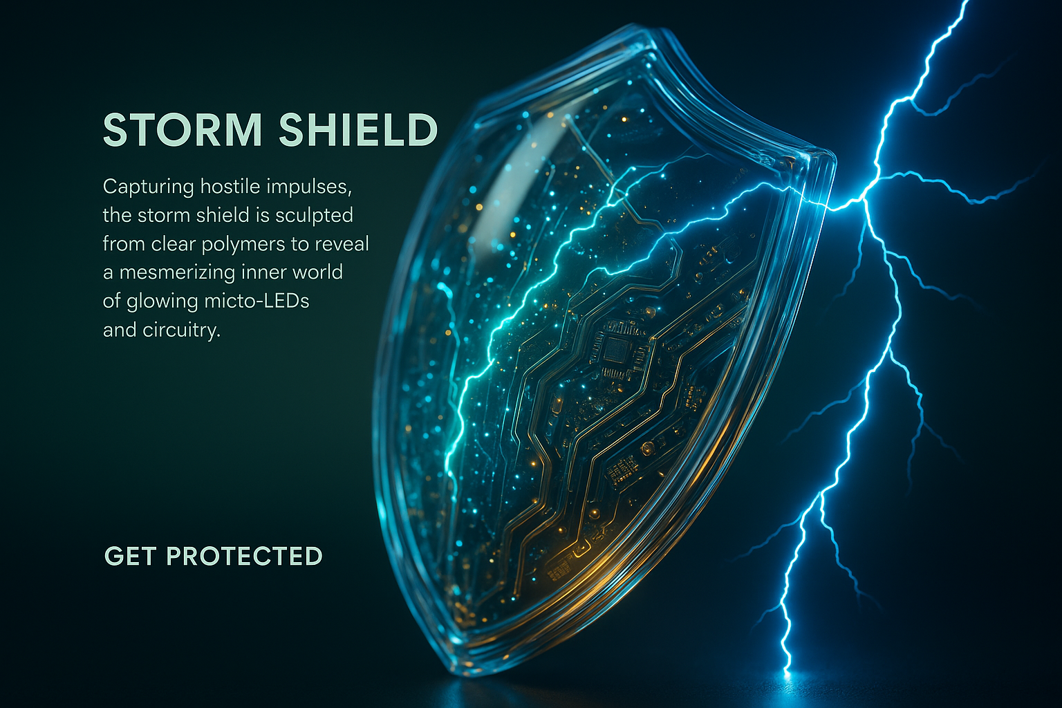 /Collection: /by davooda/Type: PNG/A hyperrealistic close-up of a storm shield crafted from clear polymers, showcasing a stunning array of glowing micro-LEDs and intricate circuitry, illuminated by neon accents.