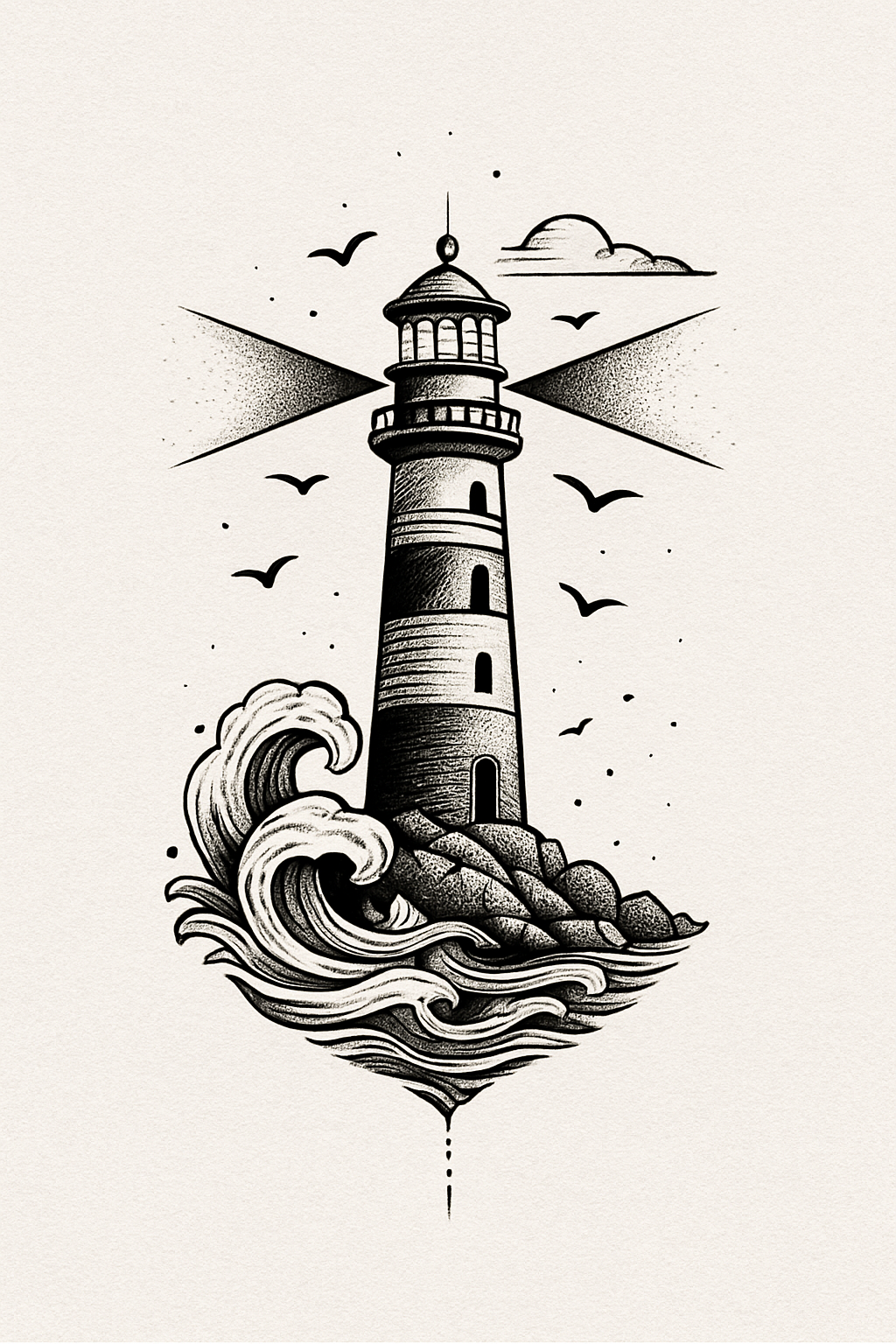 A detailed black and white illustration of a lighthouse surrounded by crashing waves and birds. Ideal for nautical-themed designs and artworks.