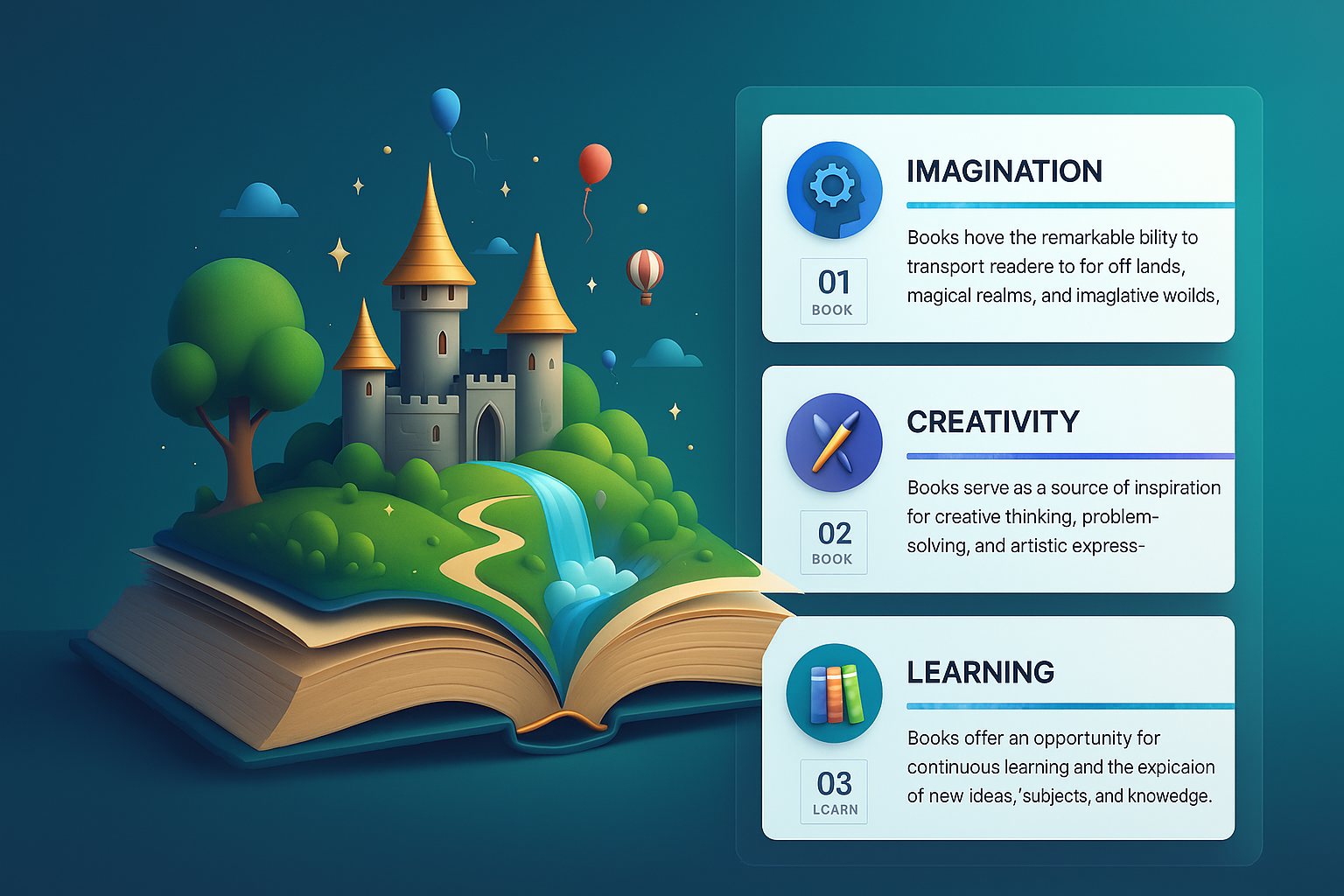 /Collection: /by davooda/Type: PNG/A vibrant 3D illustration showcases a fantasy world emerging from an open book, featuring a castle, waterfall, and floating balloons, highlighting imagination, creativity, and learning.