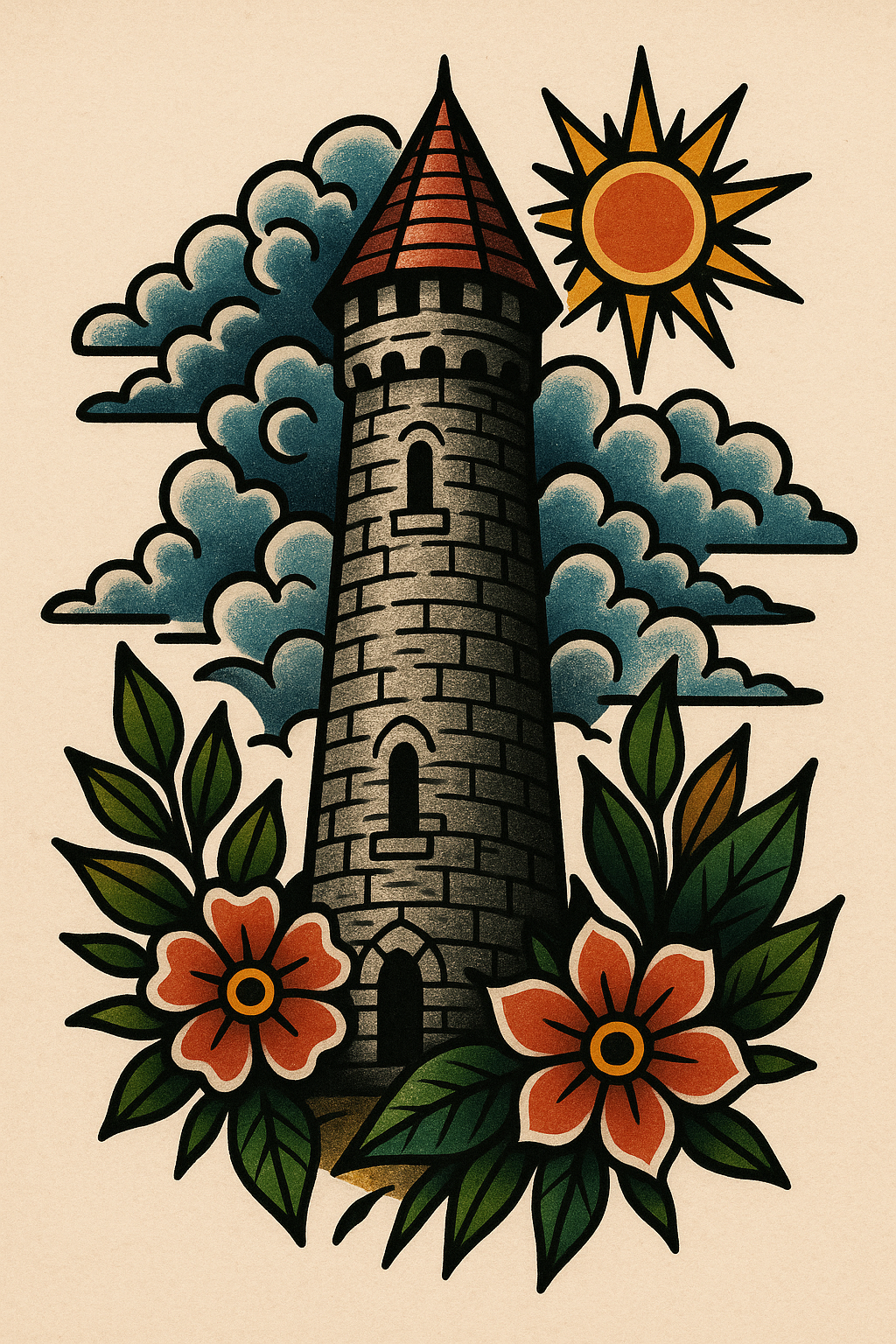 A vibrant tattoo-style illustration featuring a stone tower surrounded by clouds, flowers, and a sun, ideal for tattoo designs or decorative art.