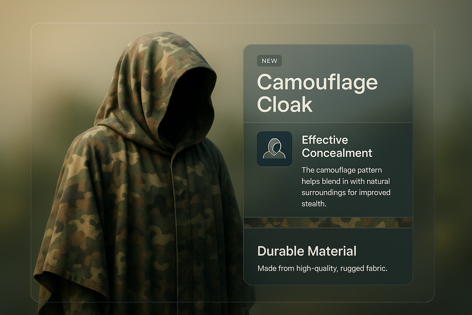/Collection: /by davooda/Type: PNG/A 3D illustration of a camouflage cloak with a subtle gradient background. It features an integrated design block showcasing effective concealment and durable material, emphasizing realism.