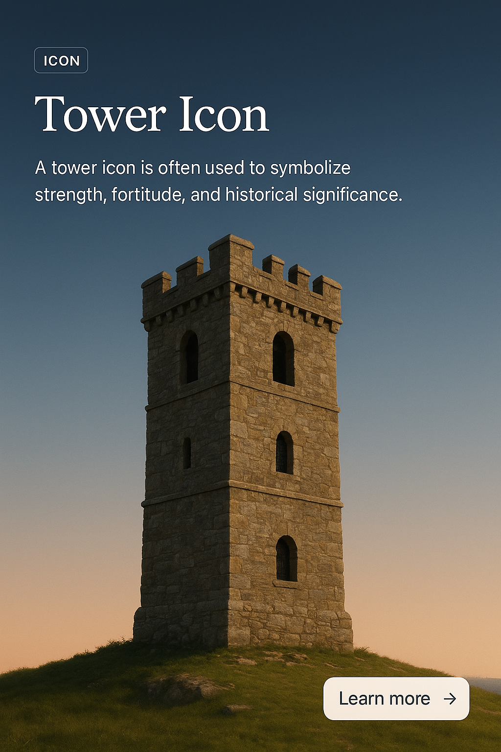 A prominent tower icon stands against a gradient sky, symbolizing strength and historical significance. The design includes a clear call-to-action button.