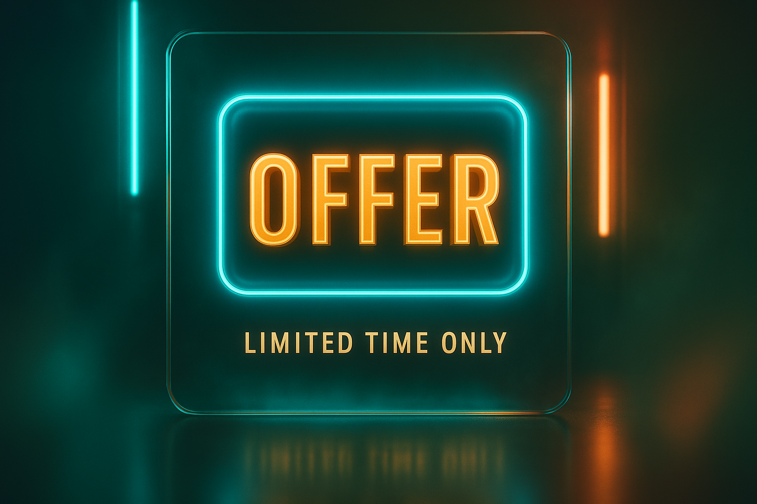 A vibrant neon sign displaying the word 'OFFER' with a glowing halo effect. The backdrop features abstract elements in deep greens and warm golds, enhancing the luminous appeal.