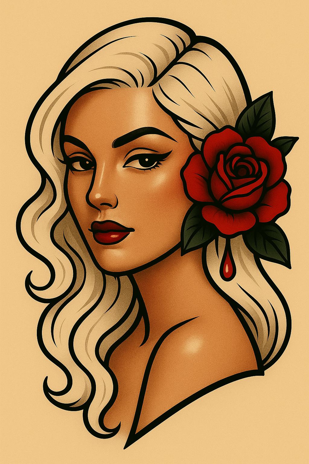 /Collection: /by davooda/Type: PNG/A stylized illustration of a woman with flowing blonde hair and a striking red rose. The rose features a droplet of blood, enhancing the dramatic effect. The background is a soft beige, providing a warm contrast.