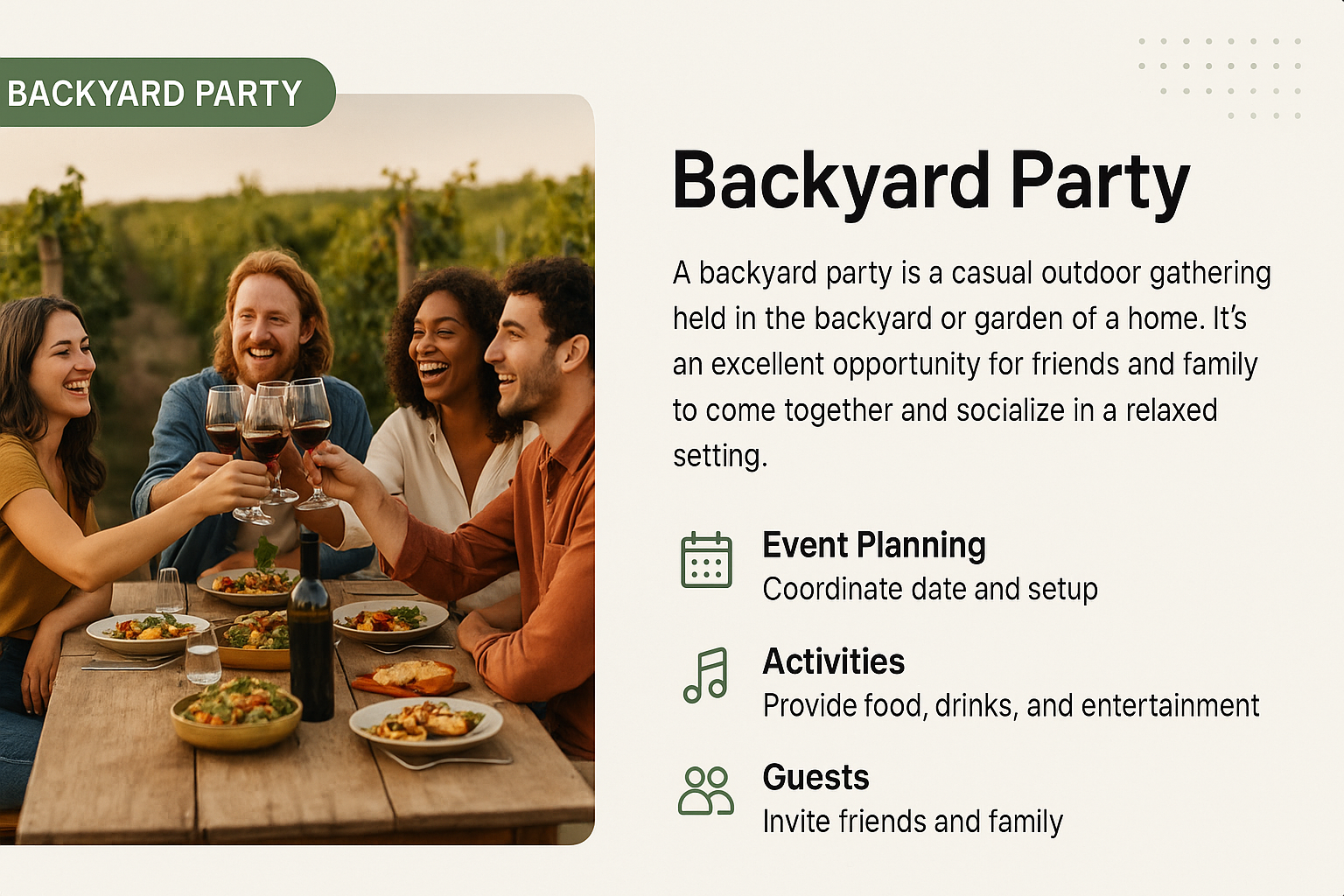 Informative graphic for planning a backyard party featuring visuals of friends enjoying food and drinks, ideal for social media or event planning resources.
