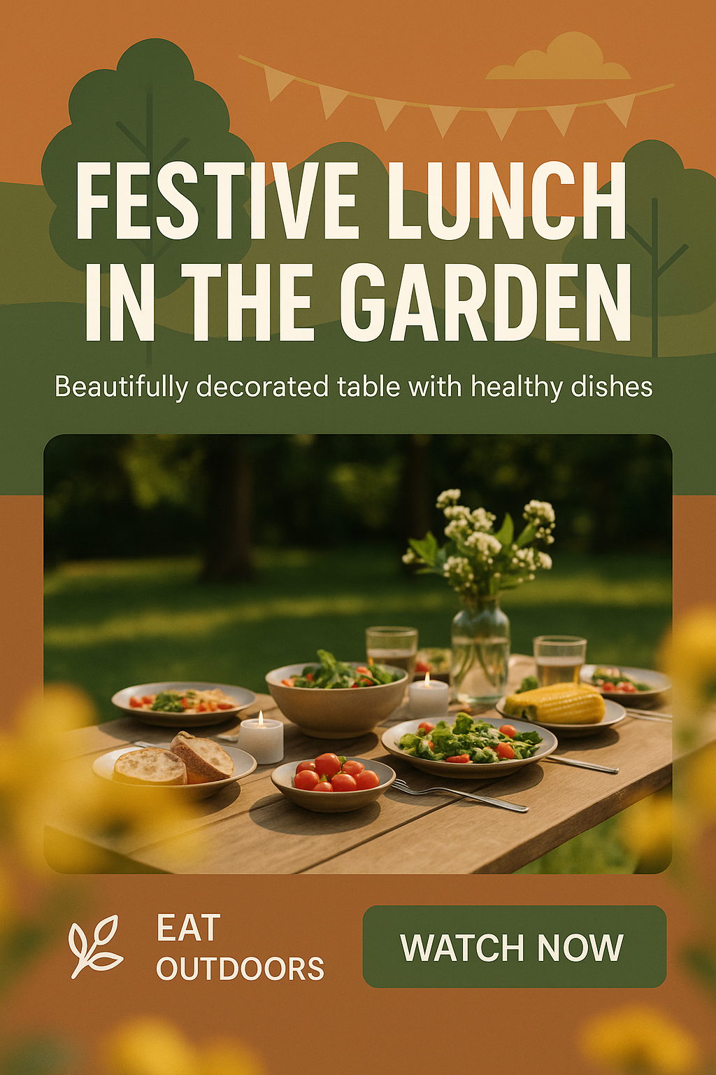 A visually appealing promotional graphic showcasing a beautifully arranged outdoor dining table filled with healthy dishes. Ideal for gardening or culinary events.