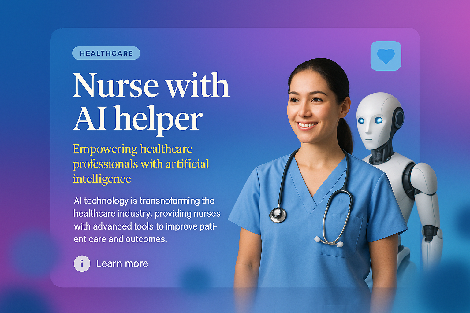 /Collection: /by davooda/Type: PNG/A nurse stands confidently with an AI robot assistant, set against a vibrant gradient background. The design features text elements emphasizing the role of AI in healthcare.