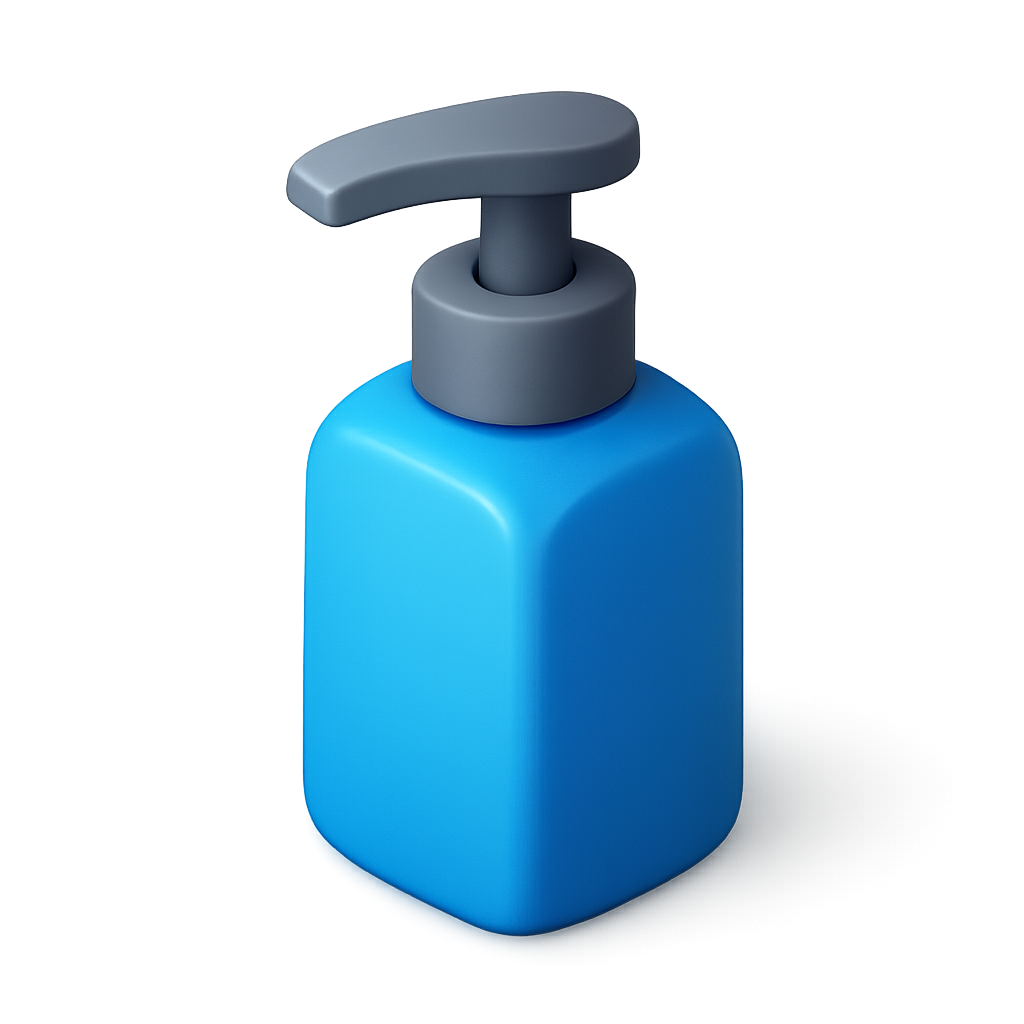 /Collection: /by davooda/Type: PNG/A visually appealing 3D icon of a soap dispenser in a three-quarter view. The design features a smooth blue body and a gray pump, set against a subtle gradient background.