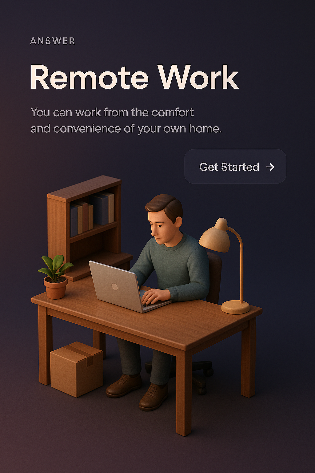 A zoomed-out 3D scene depicting a remote work environment. Features a desk with a laptop, a plant, and a lamp, set against a dark gradient background. The overall design emphasizes realism.