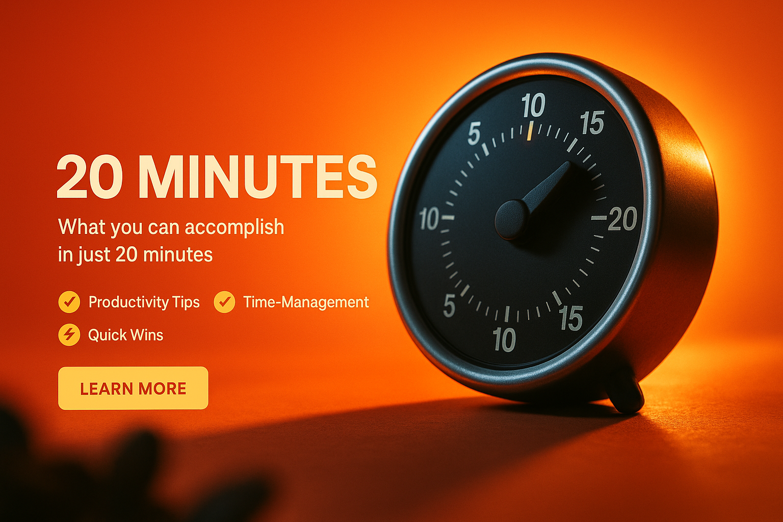 /Collection: /by davooda/Type: PNG/This social media post features a stylized clock against an orange background, promoting productivity tips that can be achieved in 20 minutes. It targets individuals seeking time management strategies.