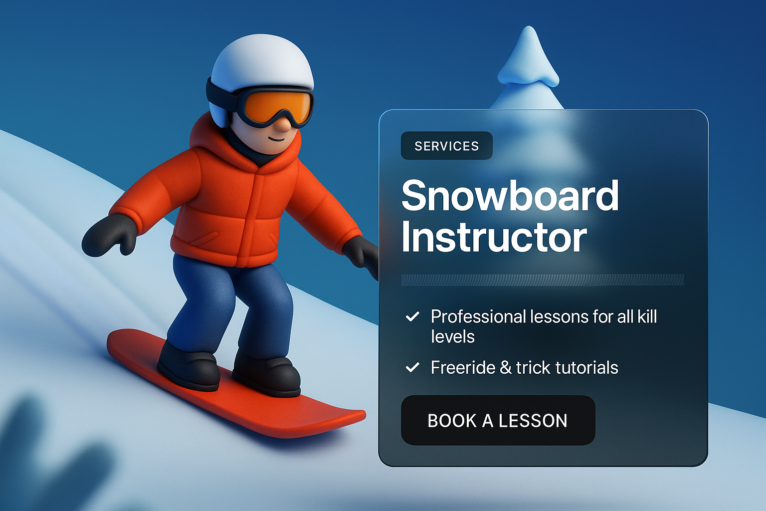 /Collection: /by davooda/Type: PNG/A vibrant 3D illustration featuring a snowboard instructor in a red jacket, riding down a snowy slope. The scene includes a modern text block displaying service offerings and a call to action.