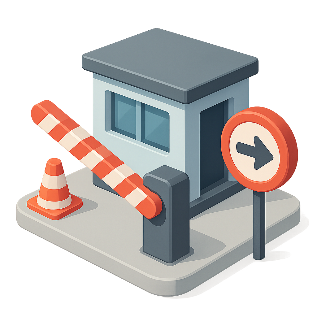 A stylized 3D illustration of a border crossing scene featuring a barrier, a traffic cone, and a directional sign. The design has a volumetric feel and a transparent background.