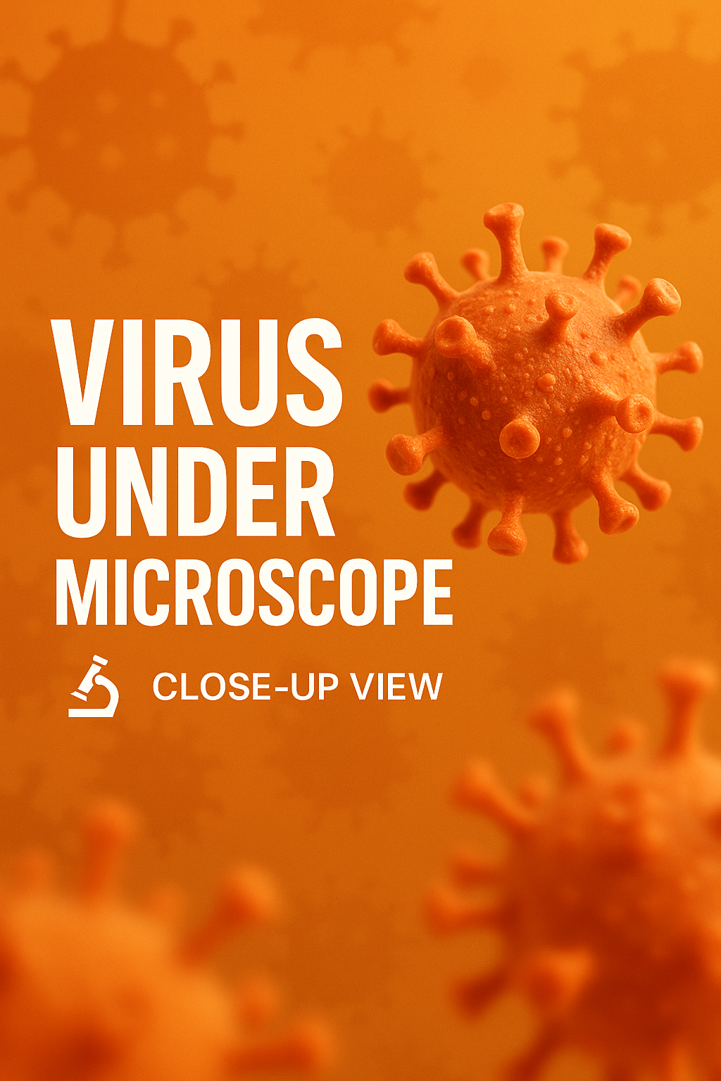 Detailed close-up view of a virus illustrated under a microscope, featuring an orange background. Ideal for educational materials or health-related content.