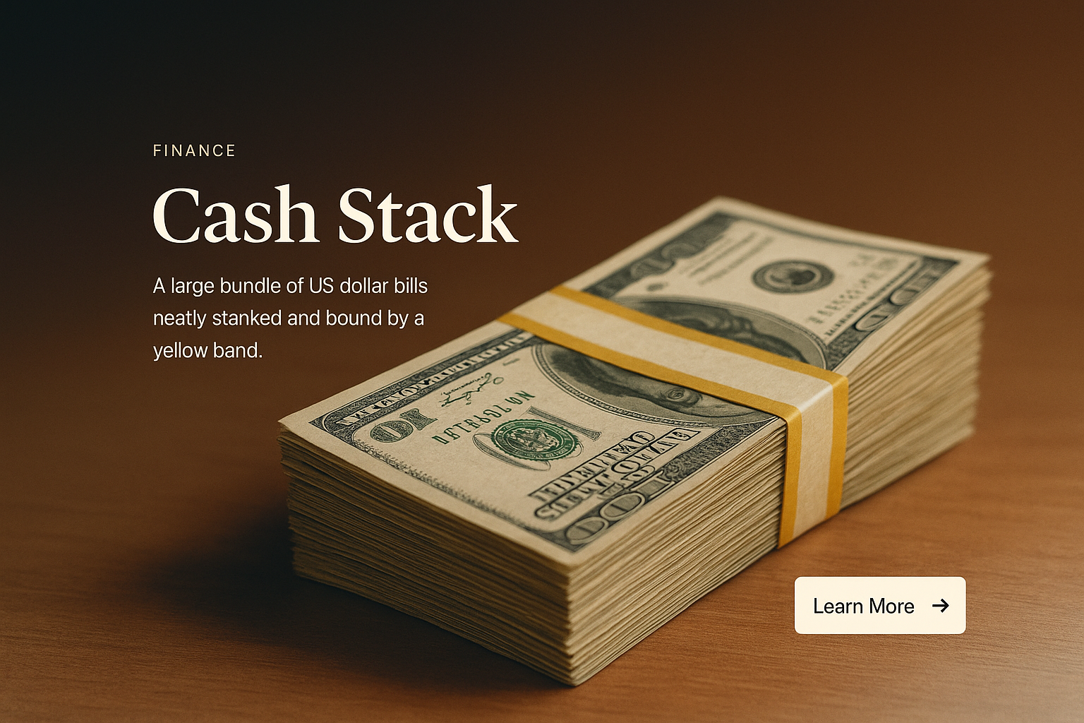 A visually appealing cash stack featuring US dollar bills bundled with a yellow band. The background has a smooth gradient, enhancing the focus on the cash.