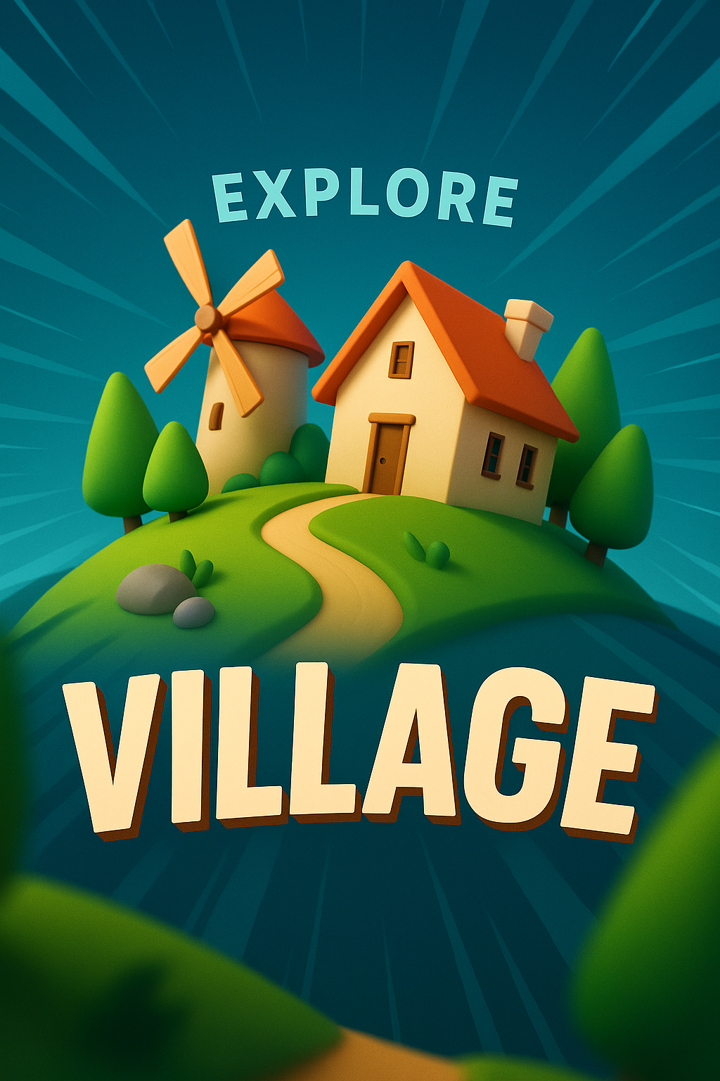 A vibrant 3D illustration of a charming village featuring a windmill and cozy houses on a hill. The dynamic perspective and bold typography invite exploration.