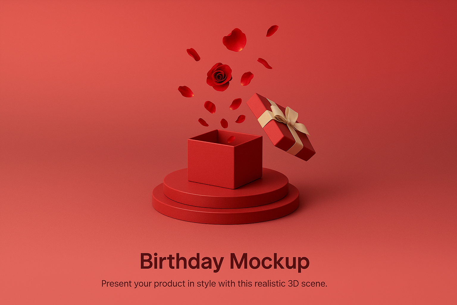 /Collection: /by davooda/Type: PNG/A vibrant 3D scene featuring a red gift box with a ribbon, surrounded by falling rose petals. Set on a podium against a smooth gradient background, this mockup is perfect for product presentations.
