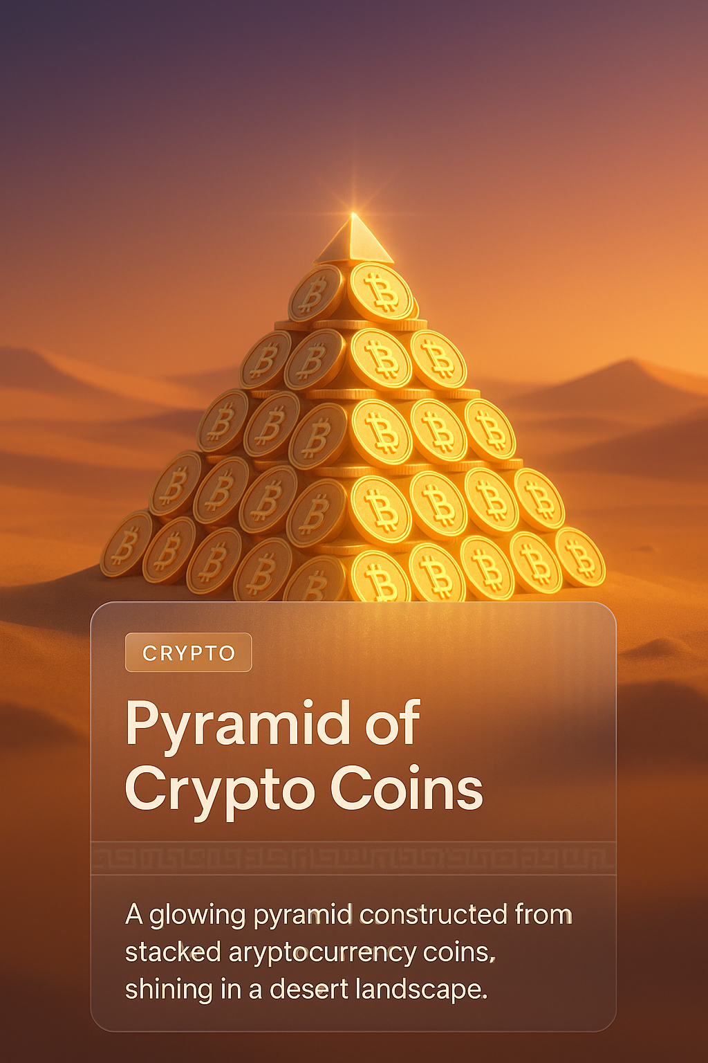 A stunning 3D illustration of a glowing pyramid made from cryptocurrency coins, set against a desert backdrop, showcasing vibrant colors and intricate details.