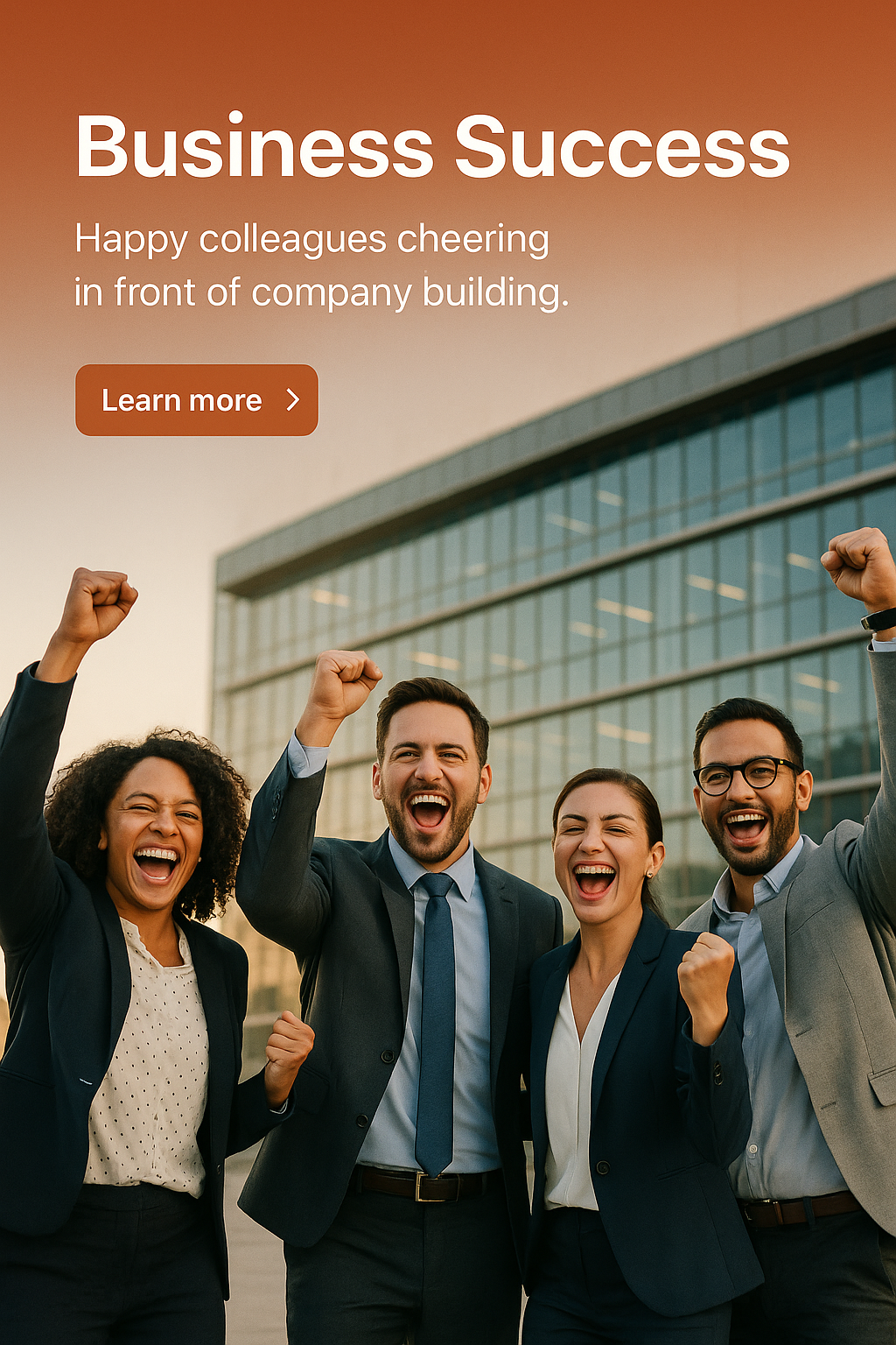 A diverse group of business professionals joyfully celebrating a corporate success, fists raised in excitement, in front of a modern company building.