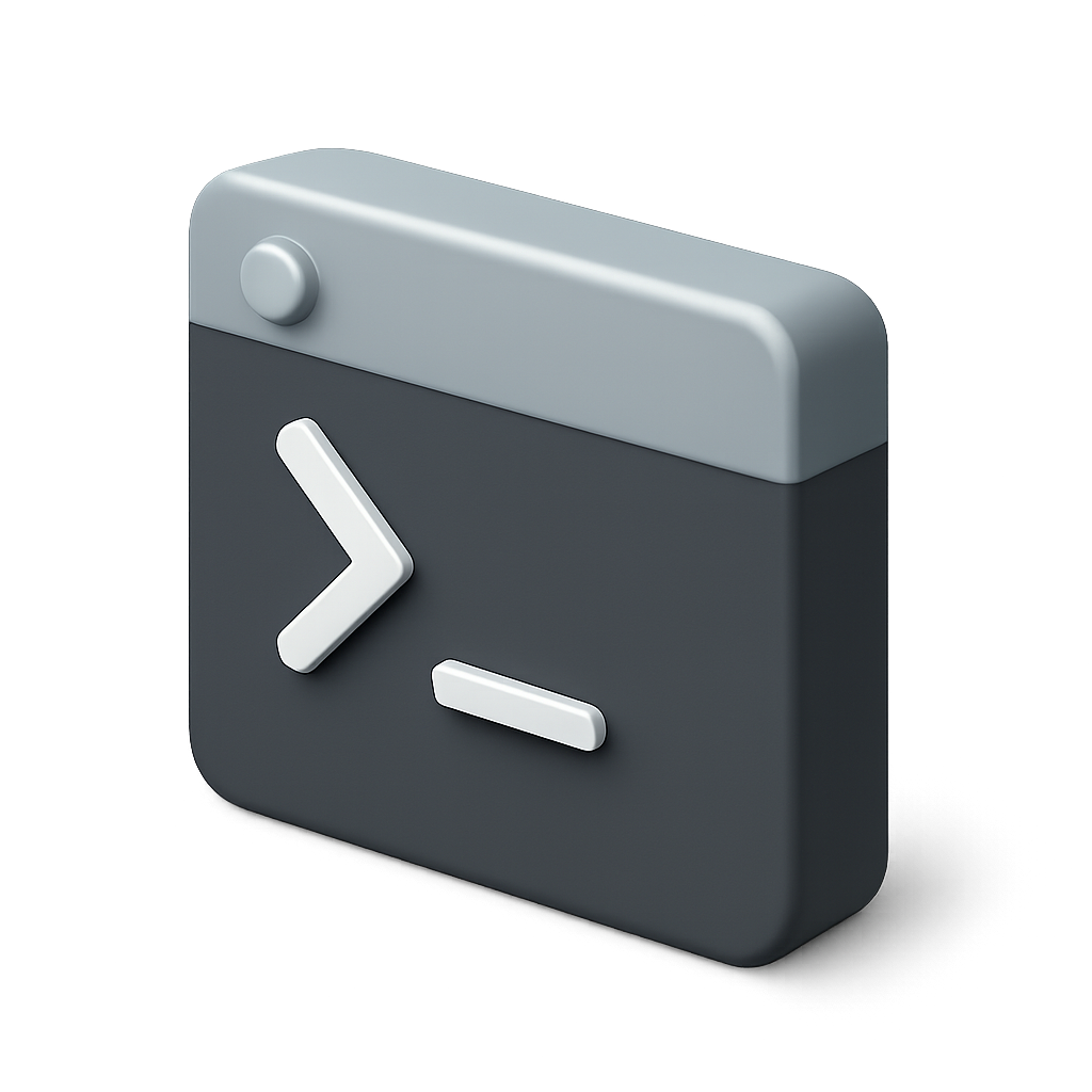 /Collection: /by davooda/Type: PNG/A sleek 3D icon representing a command line prompt, featuring a three-quarter view with volumetric depth and a transparent background, designed in an isometric style.