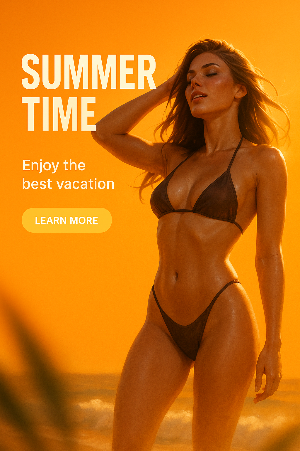 This image features a promotional summer vacation theme with a model in swimwear against a warm sunset background. Ideal for travel or lifestyle marketing.