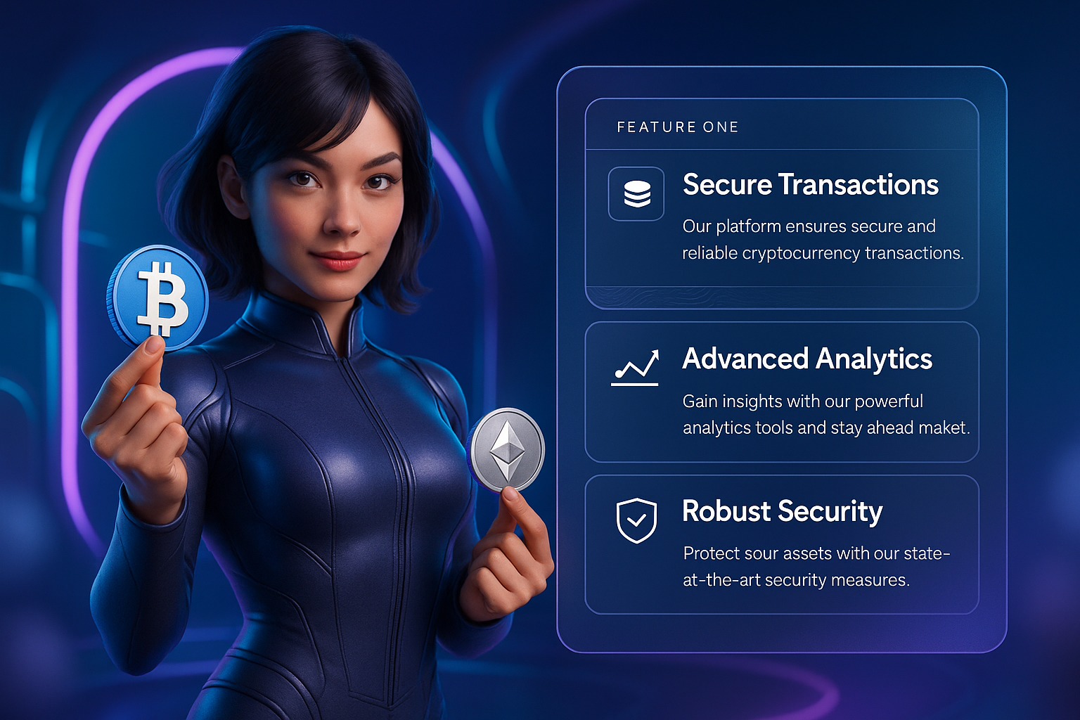 /Collection: /by davooda/Type: PNG/A futuristic woman holds cryptocurrency coins, set against a vibrant gradient background. The design features dynamic elements and informative blocks highlighting key features.